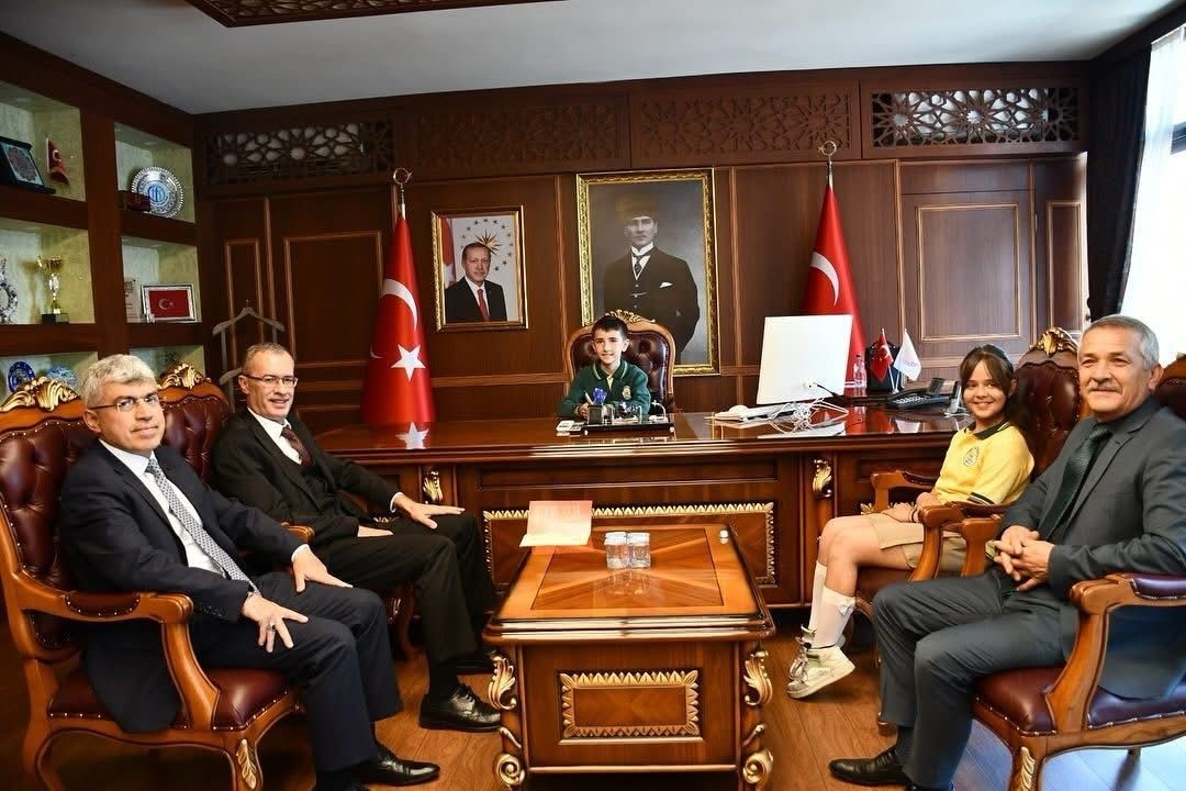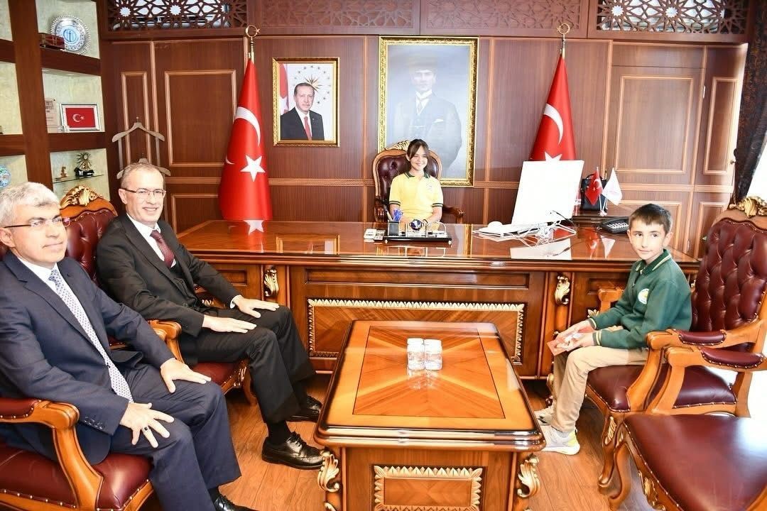 Fethiye İlçe Milli Eğitim Müdürü Faruk Kaya, Yunus Nadi İlkokulu Müdürü İsmail Cazağ, öğrenciler ile birlikte “23 Nisan Ulusal Egemenlik ve Çocuk Bayramı” dolayısıyla Kaymakam İsmail Hakkı Ertaş’ı ziyaret etti. Kaymakam Ertaş, 23 Nisan Ulusal Egemenlik ve Çocuk Bayramı dolayısıyla makam koltuğunu 4. sınıf öğrencileri Atlas Demir Erenoğlu ve Ela Olgun’a devretti.