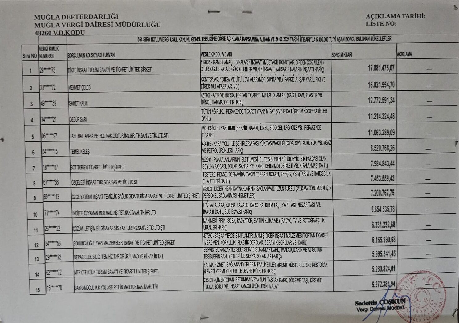 Muğla Defterdarlığı panosunda vergi borcu 5 milyonu geçen 15 şirketin ismi yayınlandı.