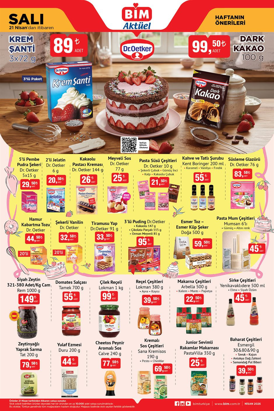 BİM AKTÜEL 21 NİSAN 2026 KATALOĞUYörsan Yayık Tereyağı 1000 gr 579 TLAknaz Peynir Çeşitleri 200 gr 79 TLOtat Yarım Yağlı Tost Peyniri 1500 gr 359 TLPeysan Yarım Yağlı Süzme Peynir 600 gr 119,50 TLPeynir Atölyesi Sepet Peyniri 149 TLYeşilada Izgara Peyniri 250 gr 84,50 TLSancak Tam Yağlı Taze Ricotta Peyniri 200 gr 79,50 TLSek %0,6 Yağlı Yoğurt 3000 gr 135 TLAltınkılıç Yaban Mersinli Kefir 250 ml 37,50 TLActivia Çilekli ve Sade Yoğurt 400 gr 62,50 TLİçim %0,5 Yağlı Süt 1 Litre 39,50 TLYörsan Laktozsuz Süt 1 Litre 47,50 TLYörsan Ayran 1,5 Litre 57,50 TLKrem Şanti 3×72 gr 89 TLDark Kakao 100 gr 99,50 TLDr.