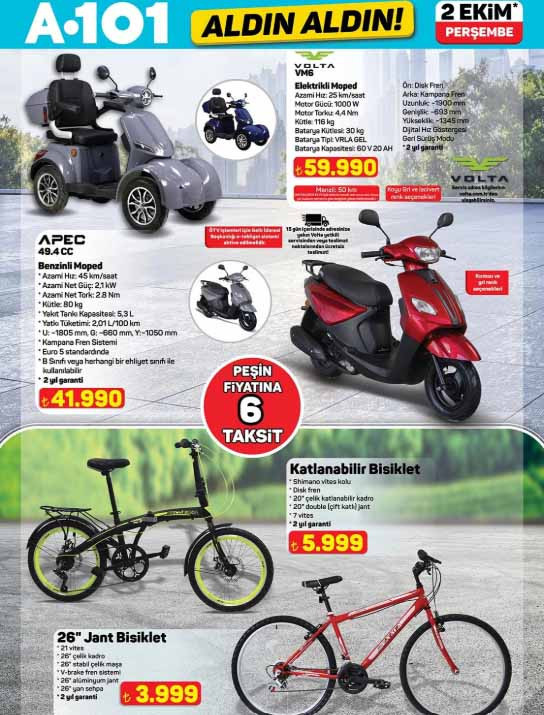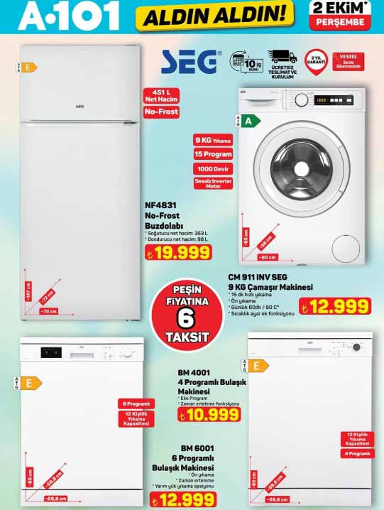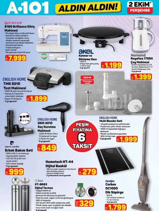 A101 indirim broşürü içerisinde; 55″ 139 ekran Smart 4K UHD Google TV 21.999 TL, taraftar lisanslı 3’lü uzatma kablosu 349 TL, dikiş makinesi 7.999 TL, tost makinesi 1.899 TL, kapaklı servis tabağı 299 TL, kapaklı katlanır mikser kabı 99,50 TL, 6’lı silikon muffin kalıbı 45 TL, katlanabilir bisiklet 5.999 TL, manuel doğrayıcı 139 TL, 1.65 L pipetli matara 139 TL, taraftar lisanslı tek kişilik nevresim seti 599 TL, 6’lı plastik elbise askısı 55 TL, bardaklı yapay orkide 65 TL, çift kişilik battaniye 429 TL ile raflarda olacak.