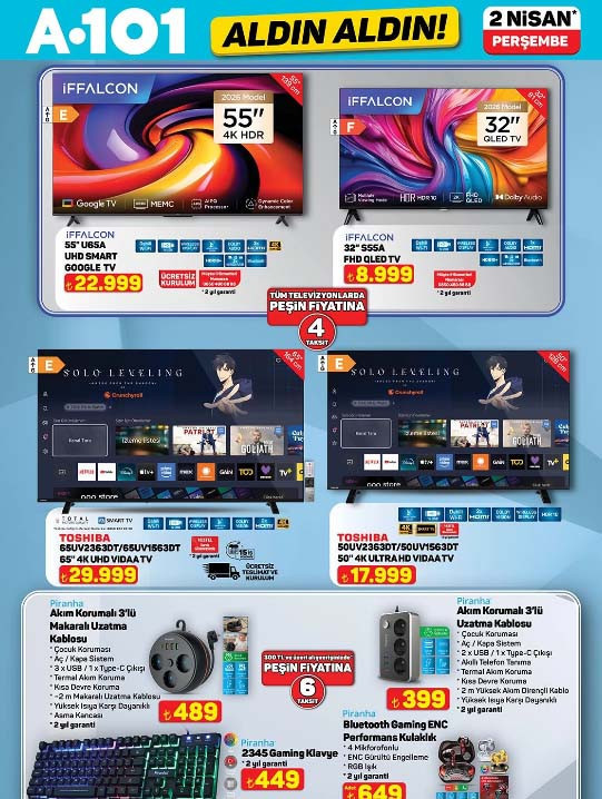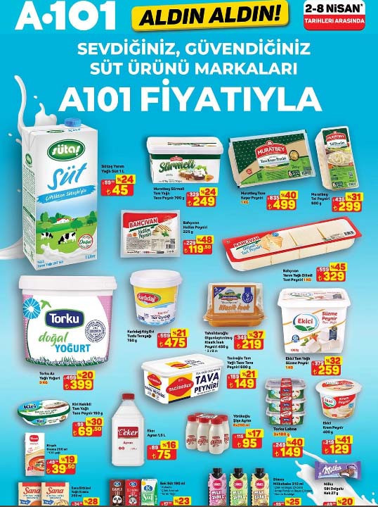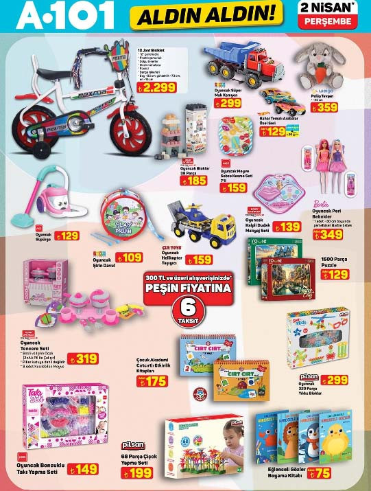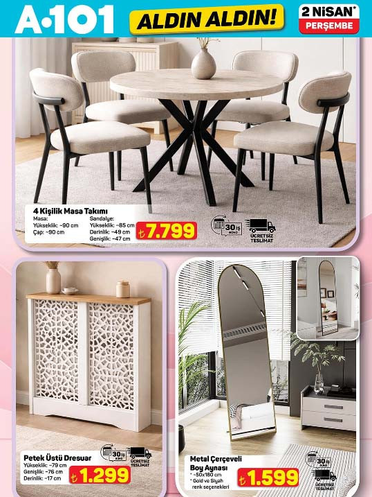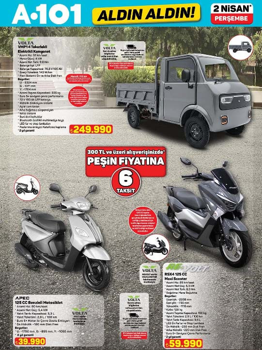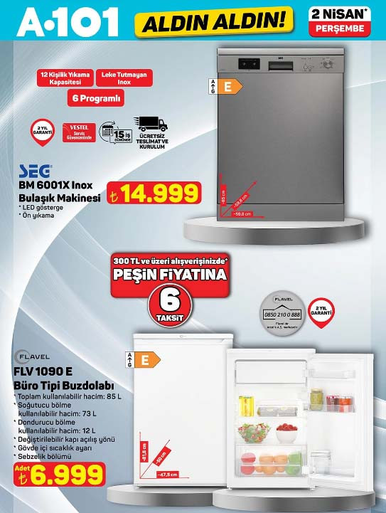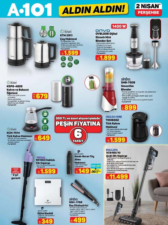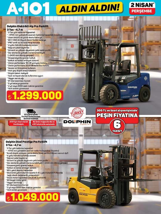 A101 bu hafta indirim afişi ile en yeni ürünleri satışa çıkmaya hazırlanıyor. 2 Nisan 2026 A101 Aldın Aldın aktüel kataloğu ile bu Perşembe bambaşka ürünler müşterilerin beğenisine sunulacak. A101 bu hafta broşürü içerisinde elektrikli Alp pro forklift 1.299.000 TL, dizel prestige pro forklift 1.049.000 TL, tekerlekli elektrikli kamyonet 249.990 TL, 65″ 4K UHD Vidaa Tv 29.999 TL, Inox bulaşık makinesi 14.999 TL, büro tipi buzdolabı 6.999 TL, XC6450/10 şarjlı dik süpürge 11.499 TL, kahve ve baharat öğütücü 679 TL, saç düzleştirici 499 TL, çay makinesi 1.599 TL, dijital baskül 349 TL, smoothie blender 899 TL, 4 kişilik masa takımı 7.799 TL, petek üstü dresuar 1.299 TL, metal çerçeveli boy aynası 1.599 TL, katlanabilir kamp sandalyesi 349 TL, olta seti 549 TL, olta makinesi 1.449 TL, buzluk termos 32 L 1.399 TL, piknik termos 15.5 L 449 TL, izolasyonlu piknik çantası 20 L 279 TL, spino ultra temizlik seti 999 TL, tavan boyası 17,5 KG 599 TL, panel kapı boyası 2,5 L 599 TL, dokuma salon halısı 1.799 TL, baza altı maxi hurç 69,50 TL ile satışa çıkacak.