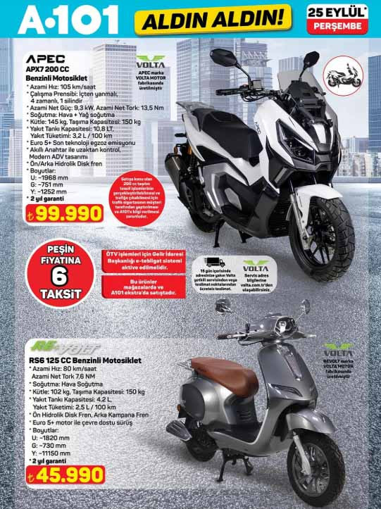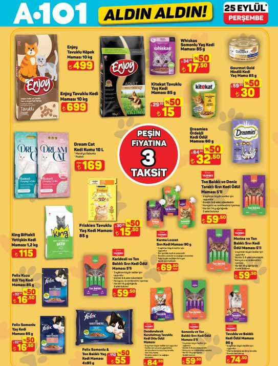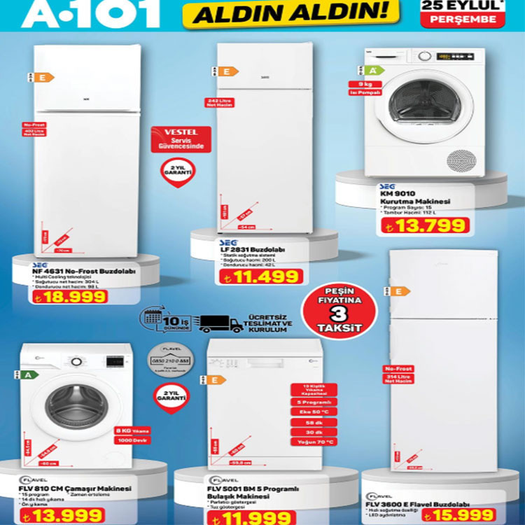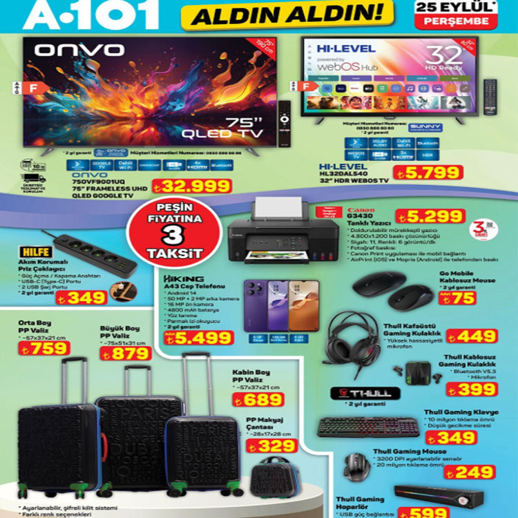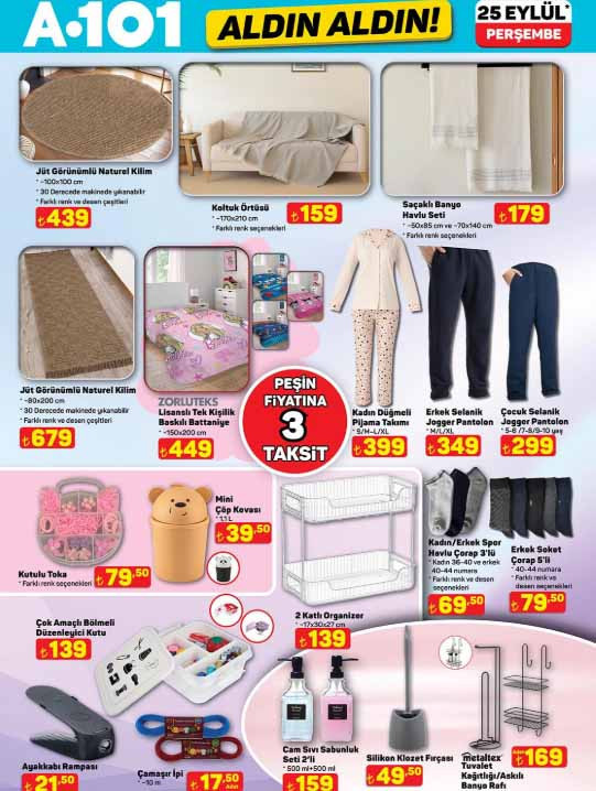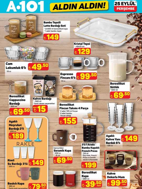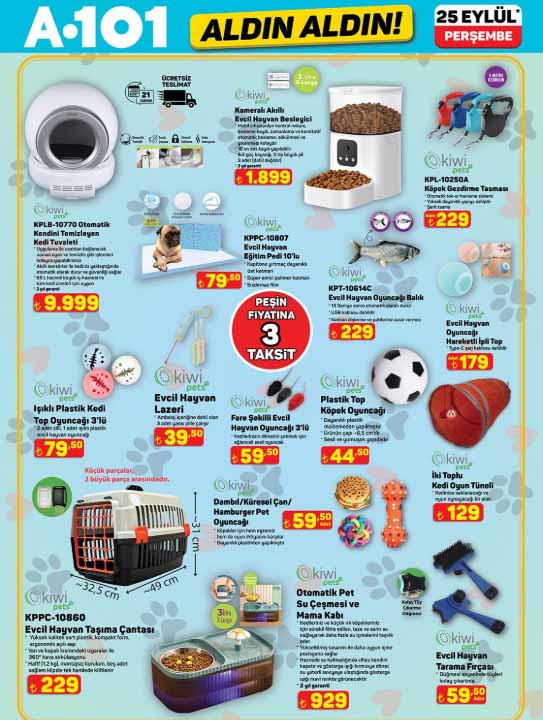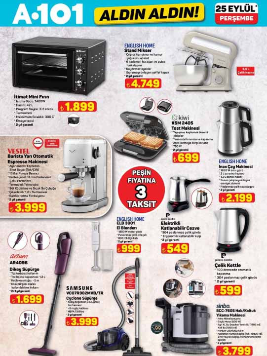25 EYLÜL A101 ALDIN ALDIN KATALOG BU HAFTA 202575″ Frameless UHD QLED Google Tv 32.999 TL32′ HDR WebOS Tv 5.799 TLTanklı Yazıcı 5.299 TLMakyaj Çantası 329 TLBüyük Boy PP Valiz 879 TLOrta Boy PP Valiz 759 TLKabin Boy PP Valiz 689 TLKablosuz Mouse 75 TLKablosuz Gaming Kulaklık 399 TLKurutma Makinesi 13.799 TLNo-Frost Buzdolabı 18.999 TL5 Programlı Bulaşık Makinesi 11.999 TLÇamaşır Makinesi 13.999 TL Mini Fırın 1.899 TLBarista Yarı Otomatik Espresso Makinesi 3.999 TLHalı / Koltuk Yıkama Makinesi 3.799 TLCyclone Süpürge 3.999 TLÇelik Kettle 599 TLStand Mikser 4.749 TLAPX7 200 CC Benzinli Motosiklet 99.990 TLRS6 125 CC Benzinli Motosiklet 45.990 TLOyuncak Pilli Süpürge 429 TLOyuncak Askılı Makyaj Çantası 119 TLOyuncak Prenses Oyun Evi 379 TLOyuncak Barbie Deniz Kızı 269 TLLisanslı 100 Parça Puzzle 59,50 TLOtomatik Kendini Temizleyen Kedi Tuvaleti 9.999 TLEvcil Hayvan Taşıma Çantası 229 TL10’lu Evcil Hayvan Eğitim Pedi 79,50 TLKameralı Akıllı Evcil Hayvan Besleyici 1.899 TLOtomatik Pet Su Çeşmesi ve Mama Kabı 929 TLKöpek Gezdirme Tasması 229 TLEvcil Havyan Tarama Fırçası 59,50 TLKedi Kumu 10 L 169 TLTavuklu Yaş Kedi Maması 15 TLKedi Ödül Maması 32,50 TLTavuklu Köpek Maması 10 Kg 499 TLHindili Kedi Yaş Mama 30 TLKristal Tepsi 129 TLBambu Tepsili Latte Bardağı Seti 149 TLBorosilikat Cappucino Bardağı 350 ml 69,50 TLKahve Dekorlu Mum 99,50 TLAyaklı Kahve Yanı Bardak 6’lı 149 TL3’ü 1 Arada Bambu Kapaklı French Press 199 TLKristal Baharatlık Seti 6’lı 149 TL6 Parça Tencere Seti 999 TLCam Küllük 39,50 TLSilikon Servis Gereçleri 29,50 TLAyaklı Meşrubat Bardağı 2’li 189 TLSilikon Tepsi Tutacağı 29,50 TLAhşap Saplı Kristal Sosluk Seti 99,50 TLSilikon Nihale 29,50 TLKilitli Saklama Kabı 2’li 79,50 TLCam Kavanoz 1,4 Litre 69,50 TL100x100 cm Jüt Görünümlü Natural Kilim 429 TLLisanslı Tek Kişilik Baskılı Battaniye 449 TL2 Katlı Organizer 139 TLÇok Amaçlı Bölmeli Düzenleyici Kutu 139 TLMetaltex Tuvalet Kağıtlığı / Askılı Banyo Rafı 169 TLAyakkabı Rampası 21,50 TLÇok Amaçlı Bölmeli Düzenleyici Kutu 139 TLKutulu Toka 79,50 TLMini Çöp Kovası 39,50 TL1 L Halı ve Koltuk Şampuanı 65 TL9 KG Toz Deterjan 425 TLBebek Bezi Çeşitleri 329 TL120’li Islak Havlı 45 TL5 KG Tiryaki Çay 1.045 TL4*100 G Türk Kahvesi 199 TL250 G Kuru Meyve Keçiboynuzu 59 TL
