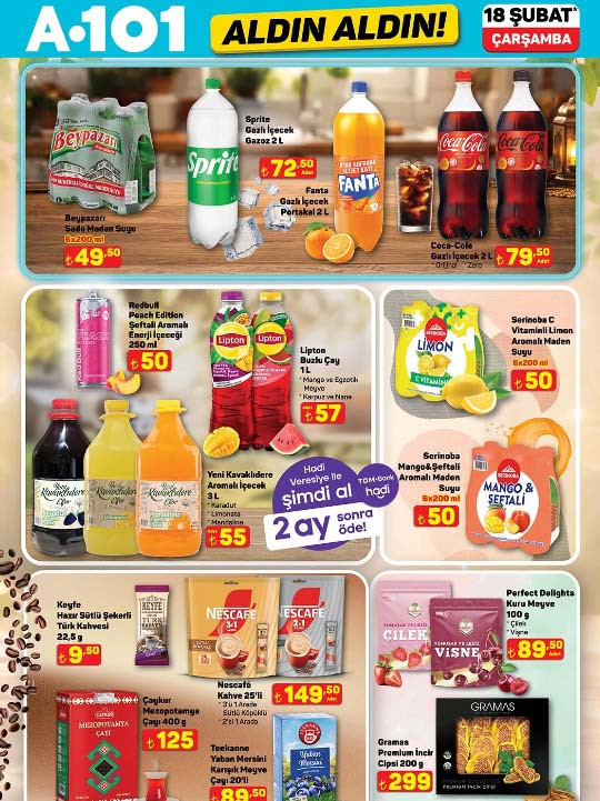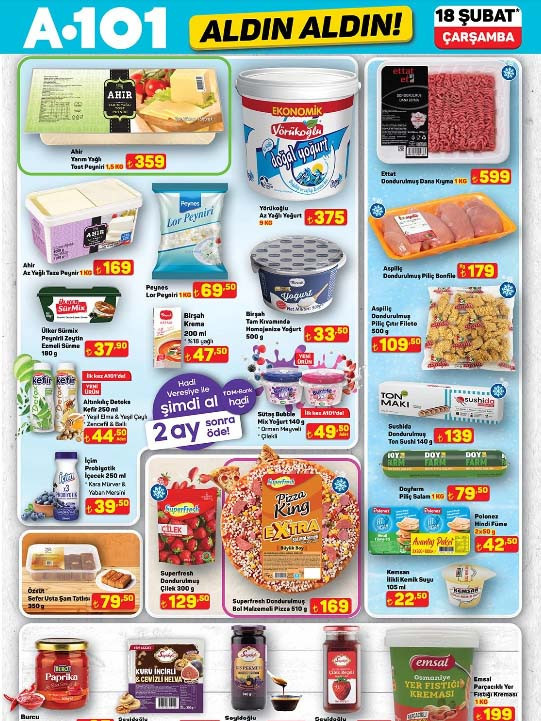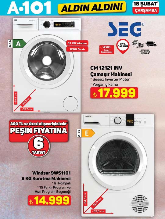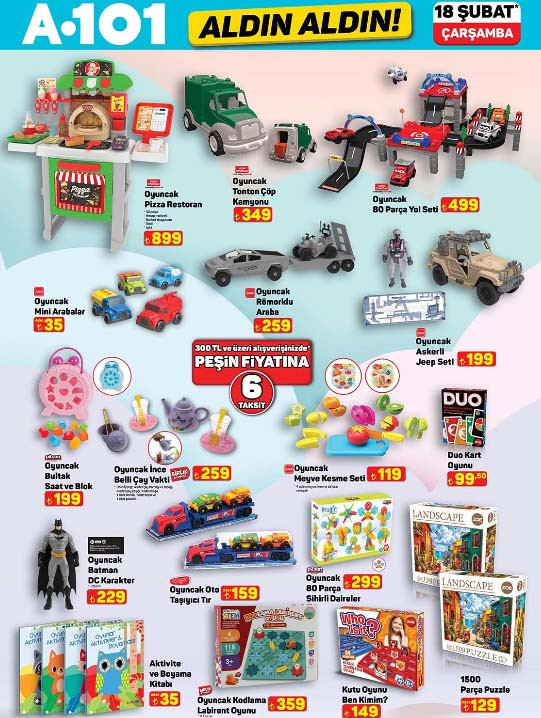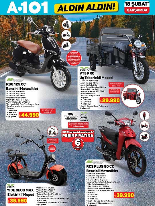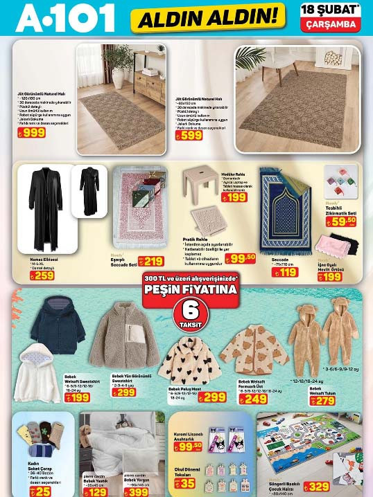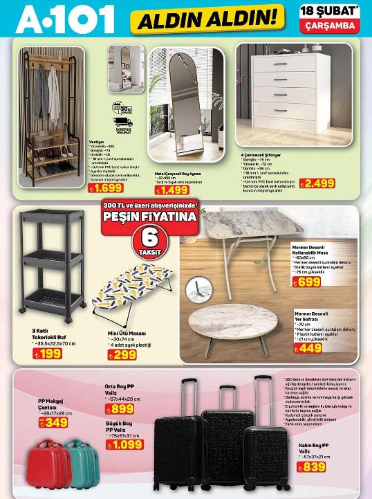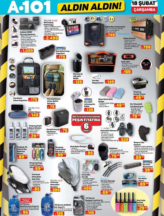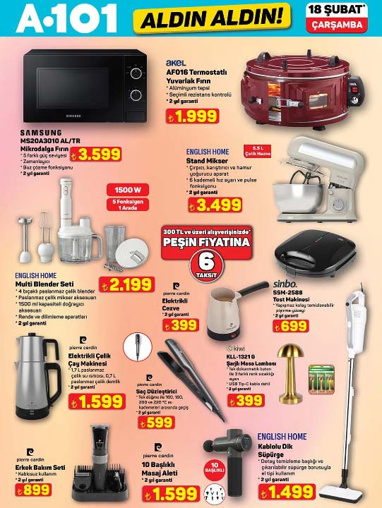 A101 aktüel afişi ve bu hafta katalog ürünleri belli oldu. 18 Şubat 2026 A101 Aldın Aldın indirim kataloğu ile bu hafta yine müzik aletlerinden mutfak gereçlerine, araç malzemelerinden beyaz eşyaya çeşitli ihtiyaçlara yönelik ürünler alışveriş severlerin beğenisine sunulacak. A101 broşürü içerisinde; 50 inç 4k ultra smart LED tv 25.999 TL, mikrodalga fırın 3.599 TL, termostatlı yuvarlak fırın 1.999 TL, SE03 max elektrikli moped 39.990 TL, oto araç kamerası 1.099 TL, dijital hava kompresörü 749 TL, motosiklet brandası 399 TL, otopark numaratörü 39,50 TL, kör nokta aynası 89,50 TL, 88 tuşlu piyano 11.499 TL, şarjlı masa lambası 399 TL, ahşap Ramazan davulu 399 TL, vestiyer 1.699 TL, boy aynası 1.499 TL, mermer desenli katlanabilir masa 699 TL, orta boy valiz 899 TL, mini ütü masası 299 TL ile listelendi. A101 aktüel katalog ürünleri bu hafta tam liste raflarda yerini alacak.