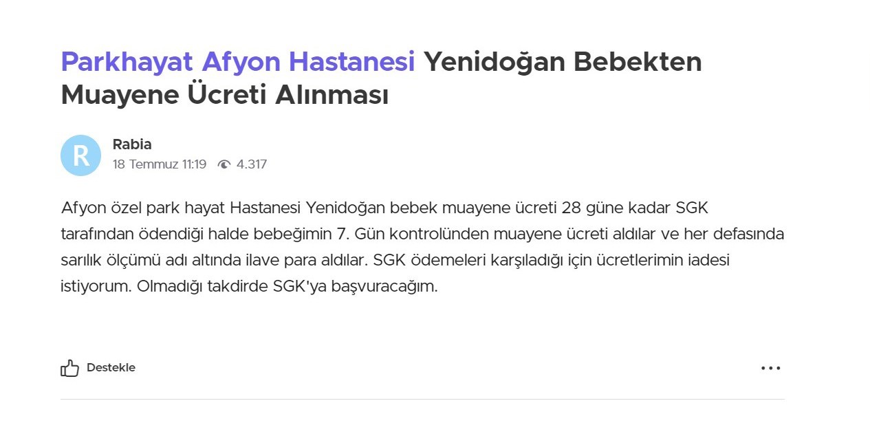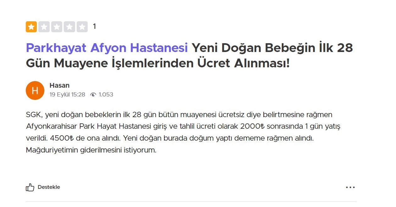Hasan isimli bir hasta yakını ise şikayetini ‘SGK, yeni doğan bebeklerin ilk 28 gün bütün muayenesi ücretsiz diye belirtmesine rağmen Afyonkarahisar Park Hayat Hastanesi giriş ve tahlil ücreti olarak 2000 TL sonrasında 1 gün yatış verildi. 4500 TL’de ona alındı. Yeni doğan burada doğum yaptı dememe rağmen alındı. Mağduriyetimin giderilmesini istiyorum’ ifadeleri ile mağduriyetini dile getirdi.