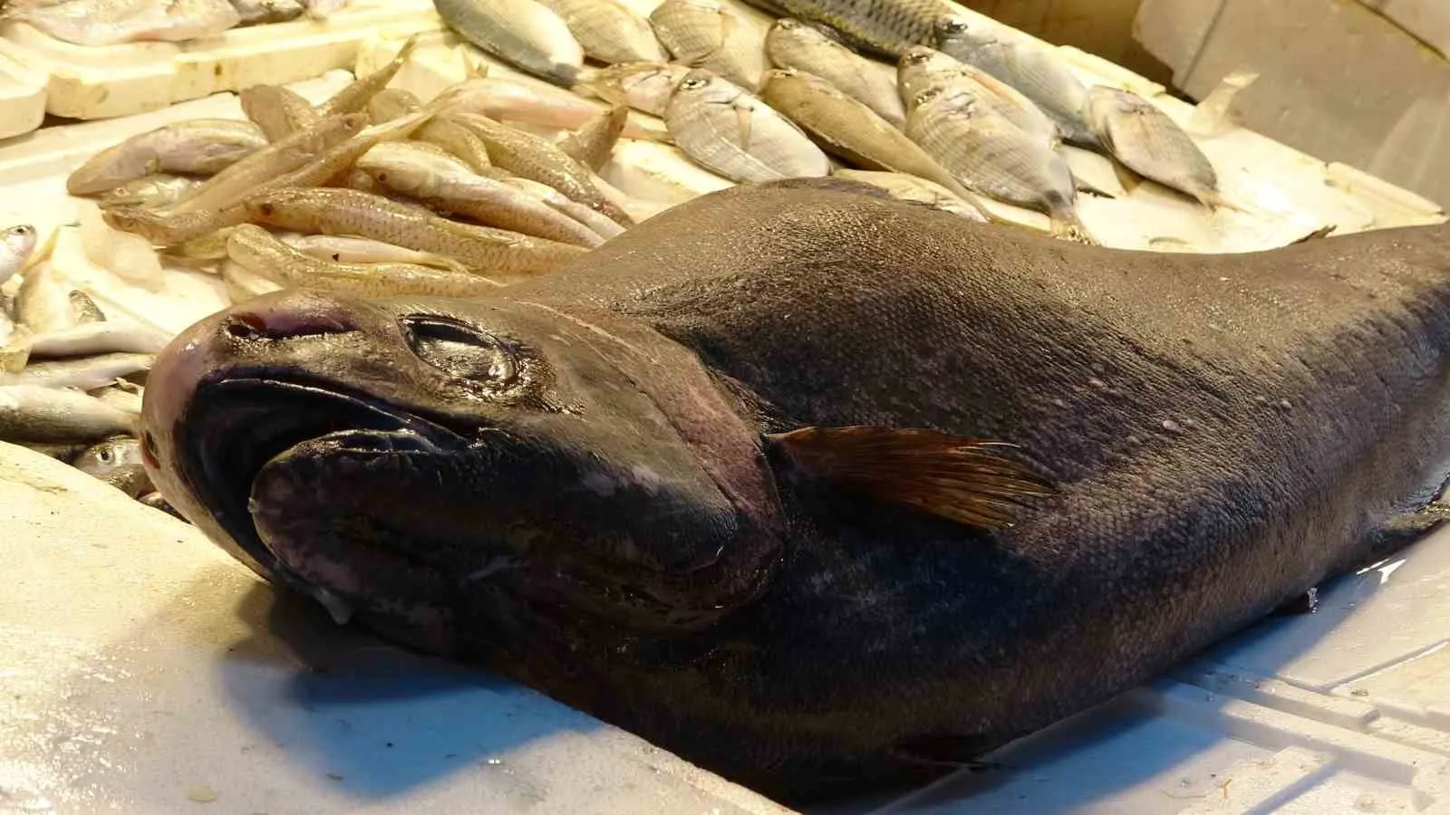Mersin’de Akdeniz’de nadir görülen yaklaşık 1,5 metre boyunda, 25 kilogram ağırlığındaki ’Atlas balığı’ yakalanarak tezgahta sergilendi.