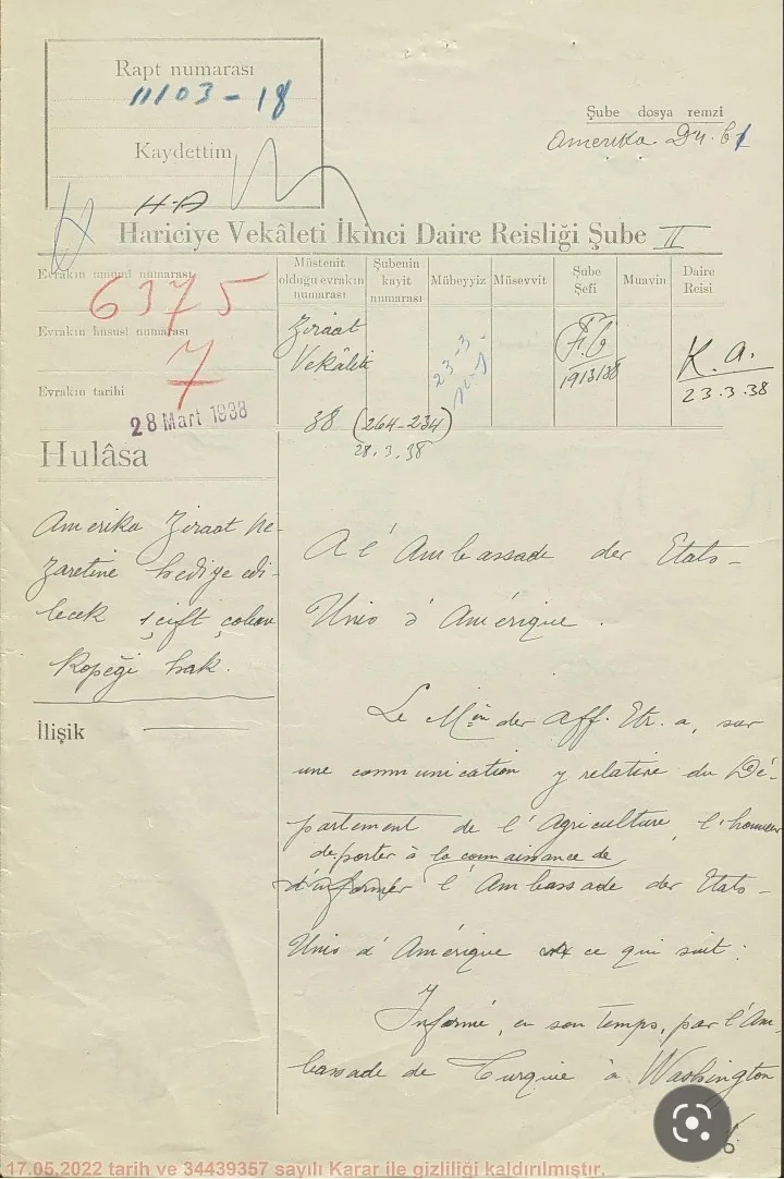 1938 yılında Atatürk’ün onayıyla diplomatik bir jest olarak Erzurum’dan ABD’ye
