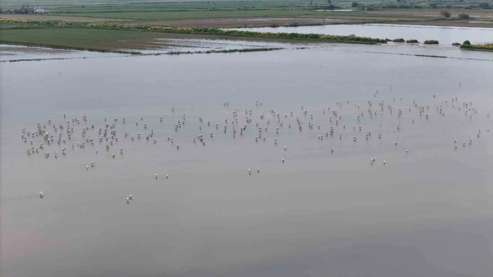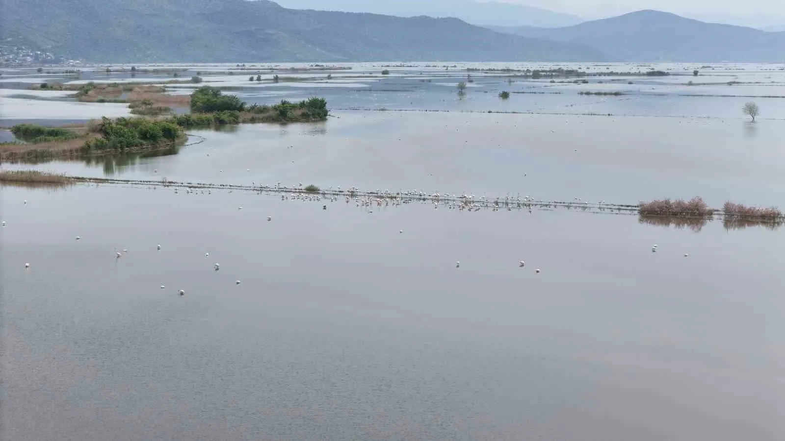 Aydın’ın Söke ilçesinde Büyük Menderes Nehri’nin taşması sonucu sular altında kalan tarlalar, flamingoların beslenme noktası haline gelirken, sürü halinde tarlalarda gezen allı turnalar görsel şölen oluşturdu.