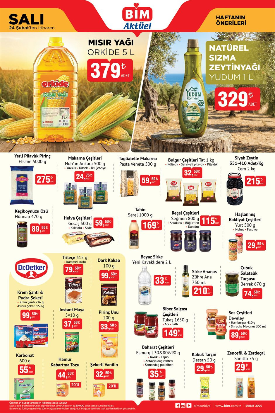 BİM AKTÜEL 24 ŞUBAT 2026Aknaz Rende Mozzarella Peyniri 200 gr 89,50 TLAknaz Yarım Yağlı Tava Peyniri 1000 gr 199 TLAknaz Krem Peynir 2×150 gr 62,50 TLLezita Piliç Schnitzel 1080 gr 99 TLBanvit Lezita Piliç Baget 1000 gr 69,90 TLRamiz Dana İnegöl Köfte 500 gr 319 TLAkşeker Dana Sac Kavurma 300 gr 209 TLSultan Et Dilimli Dana Sucuk 350 gr 219 TLBanvit Çıtır Piliç Pane 275 gr 49 TLPınar Hindi Uzun Sosis 430 gr 79 TLPolonez Hindi Salam 2×90 gr 42,50 TLOrkide Mısır Yağı 5 Litre 379 TLYudum Natürel Sızma Zeytinyağı 1 Litre 329 TLEfsane Yerli Pilavlık Pirinç 5000 gr 275 TLNuhun Ankara Makarna Çeşitleri 24,75 TLPasta Veneta Tagliatelle Makarna 500 gr 59,50 TLTat Bulgur Çeşitleri 1000 gr 32,50 TLCem Siyah Zeytin 2 kg 215 TLHünnap Keçiboynuzu Özü 470 gr 89,50 TLGesaş Helva Çeşitleri 500 gr 59,50 TLBingo Toz Deterjan 10 kg 399 TLMr Bee Lavabo Fayans Temizleyici 1500 ml 89 TLAngie Parfüm Kadın 100 ml 209 TLAngie Vücut Spreyi 150 ml 99 TLAngie El Kremi 75 ml 49 TLRepute Deodorant 150 ml 69 TLQuickdish Sakura Sünger 79 TLPofu Islak Havlu 20 TLGreenworld Oda Kokusu 49 TLBrut Erkek Parfüm 100 ml 399 TL