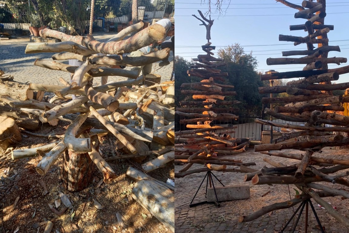 Bodrum Belediyesi, yeni yıl süslemeleri kapsamında ağaç budama çalışmalarından arta kalan odun ve dalları değerlendirerek yılbaşı ağacı yaptı.