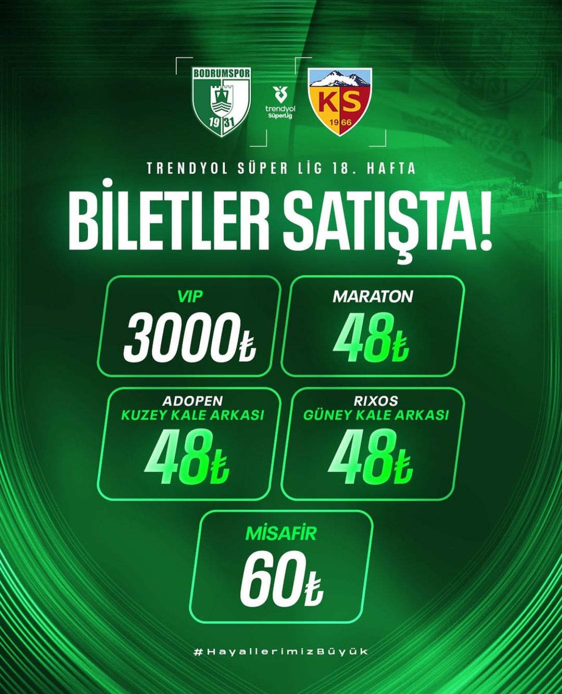 Spor Toto Süper Lig’de mücadele eden Sipay Bodrum FK, yeni yıla taraftarlarını sevindirecek bir kampanyayla girdi. 5 Ocak Pazar günü saat 16.00’da Kayserispor’u konuk edecek yeşil-beyazlı ekip, bu özel maç için bazı tribün biletlerini yalnızca 48 TL’den satışa sunduğunu açıkladı.