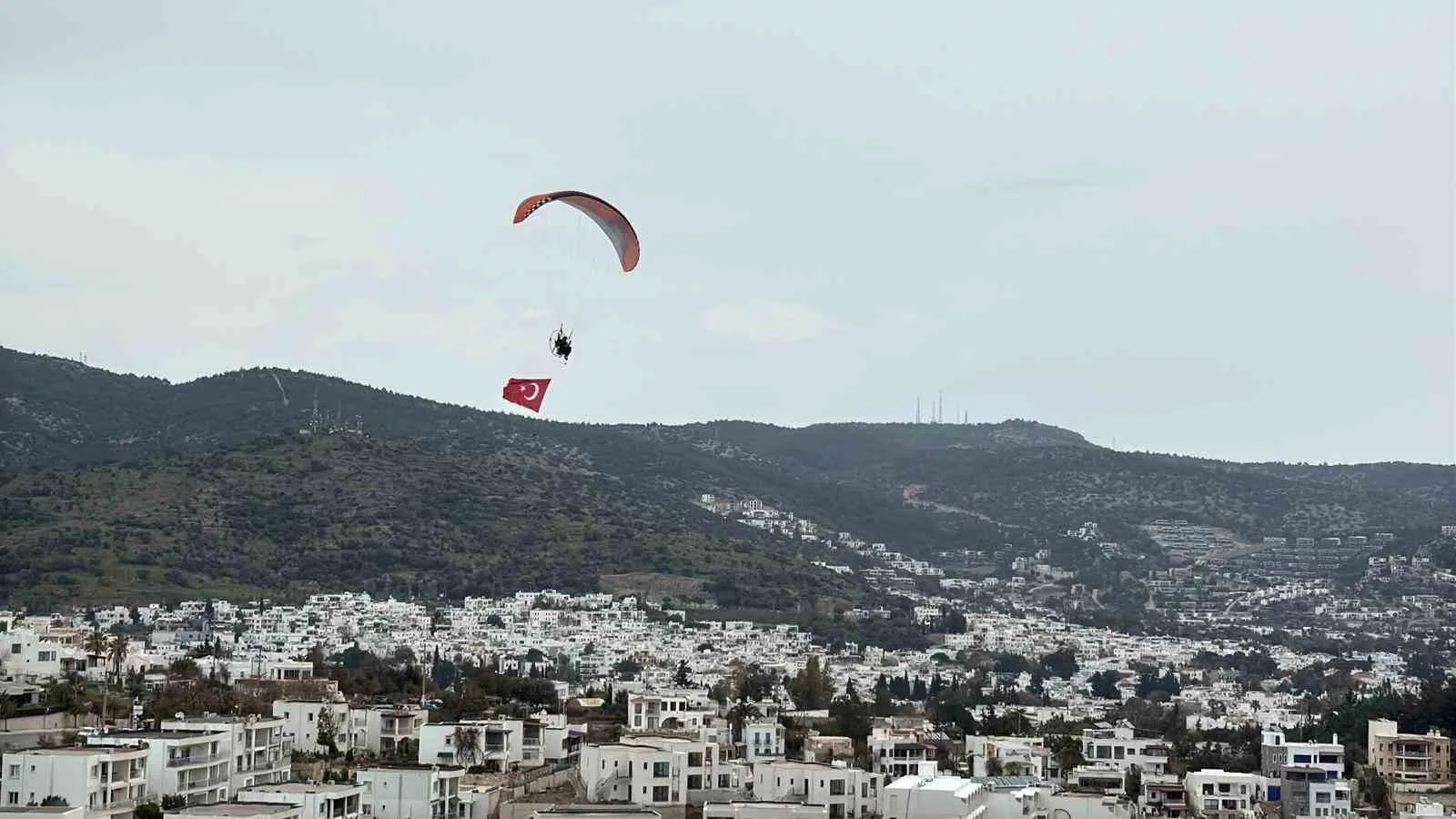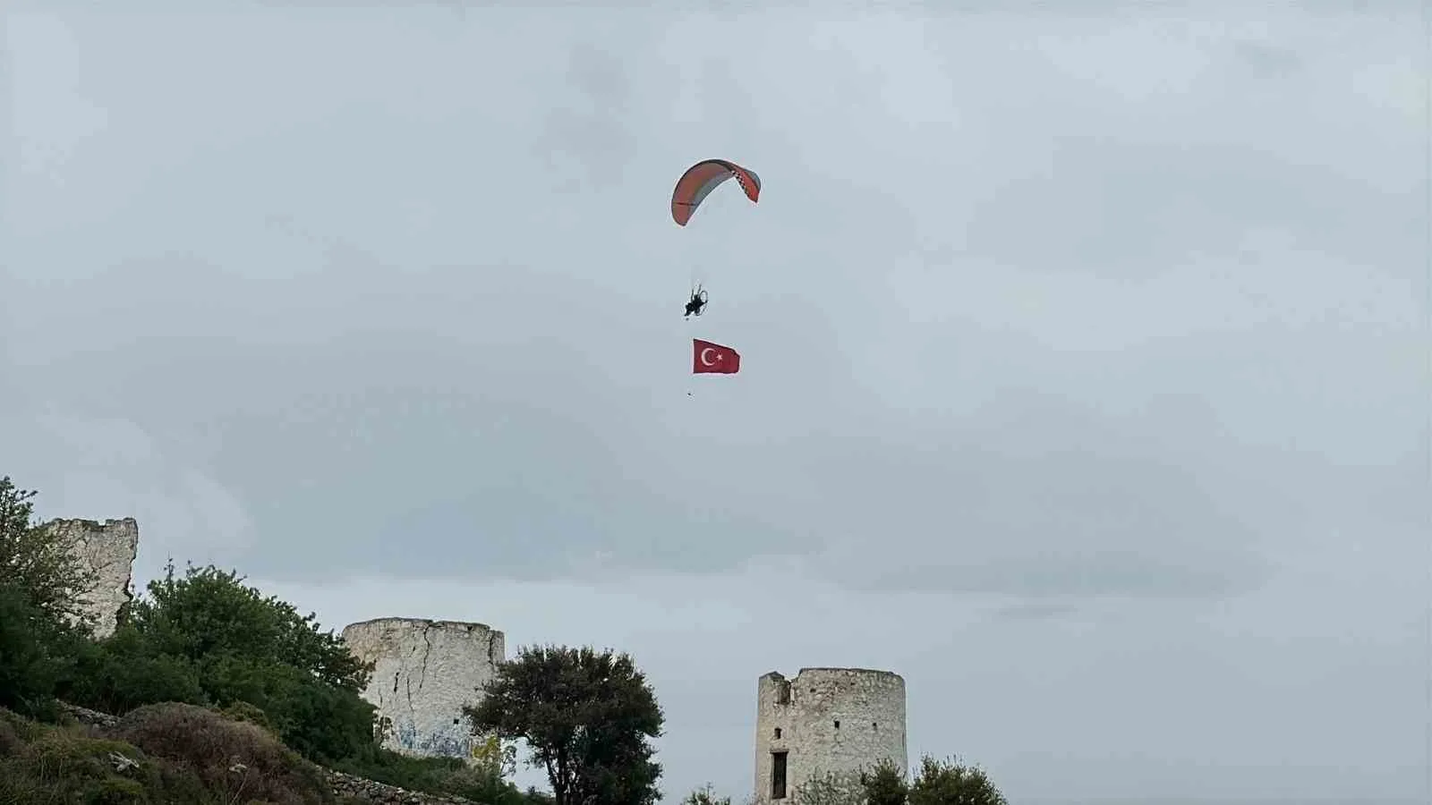 Bodrum’da yaşayan yamaç paraşütü ve paramotor pilotu Seyfi Çağlar Özgül, Çanakkale Deniz Zaferi’nin 111’inci yılı kapsamında anlamlı bir etkinliğe imza attı. Gümbet Değirmenler mevkisinde hazırlıklarını tamamlayan Özgül, paramotoruna bağladığı Türk bayrağıyla havalandı. Yaklaşık 45 dakika süren uçuşta Bodrum Kalesi, Kumbahçe ve Gümbet hattında süzülen Özgül, gökyüzünde açtığı dev bayrakla görsel şölen sundu. Sahil şeridinde bulunan çok sayıda kişi, o anları cep telefonlarıyla kayda aldı.