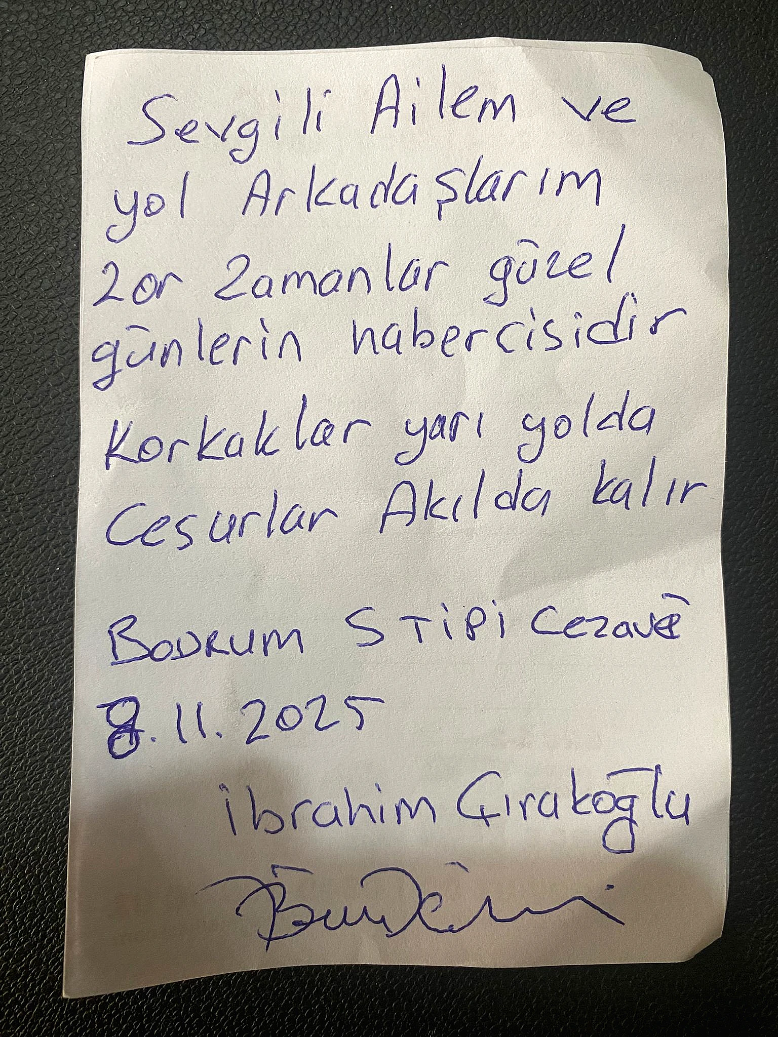 İbrahim Çırakoğlu, mektubunda, “Zamanlar güzel günlerin habercisidir. Korkaklar yarı yolda kalır, cesurlar akılda kalır” ifadelerine yer verdi.