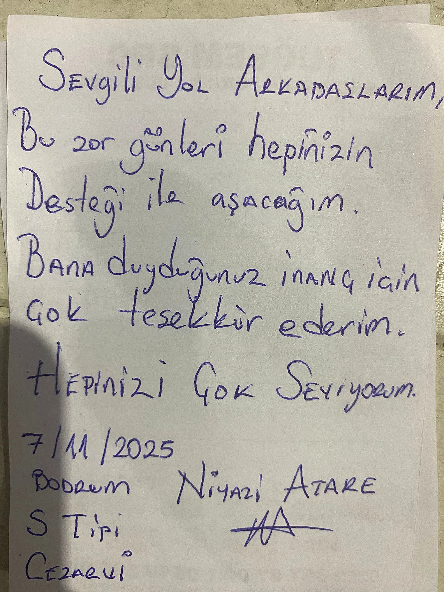 Niyazi Atare ise mektubunda, “Bu zor günleri hepinizin desteği ile aşacağım. Bana duyduğunuz inanç için çok teşekkür ederim. Hepinizi çok seviyorum.” mesajını paylaştı.