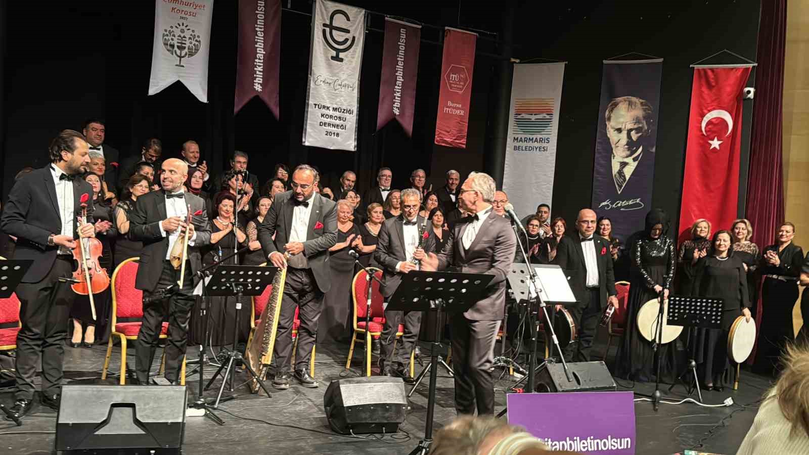 Konsere Bursa’dan gelen ve bilet yerine kitap oluşumun önderlerinden Elif Neslihan Hanoğlu ‘’Ben ve dostlarımla birlikte bundan dört yıl önce Bursa’da bir Türk Müziği konserinde başlattığımız projedir. Türkiye’nin dört bir tarafına yayılıyoruz. Bizimle işbirliği yapan dostlarımız var, öğretmenlerimiz var ve STK’larımız var. Bu minvalde konserlere gelirken veyahut sanat sergilerine giderken bir kitap biletin olsun diyor. Kütüphanelerinde kitapları olmayan, Türk müziğini tanımayan, Türk müziği ile hemhal olan ve kütüphanelere yardım etmek üzere bizimle yol arkadaşlığı yapan binlerce bağışçımız var. Bu minvalde bugün Marmaris’te. Marmaris Belediyesi Başkanı Acar Ünlü beyefendi önderliğinde bir kitap biletin olsun, Marmaris’te bir kitap biletin olsun Türkiye diyerek bugün Erdinç Çelikkol, Türk Müziği Derneği, Bursa İTÜ Türk Müziği Derneği ve Yüzüncü Yıl Orhangazi Cumhuriyet Korosu ile birlikte Armutalan Sahnesi’nde 24 Kasım Öğretmenler gününe binaen öğretmenlerimiz için Başöğretmen Atatürk’ün en sevdiği besteleri, kurtuluşun türkülerini ve Cumhuriyetin marşını birlikte okuyacağız’’ dedi.