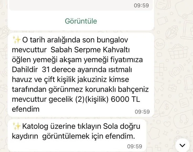 Olay, Antalya’da yaşayan genç bir kadının arkadaşına doğum günü sürprizi yapmak istemesiyle başladı. Hafta sonunu arkadaşıyla birlikte geçirmek isteyen kadın, sosyal medyada gördüğü bungalov ilanı üzerinden iletişime geçti. Hesap yöneticisi tarafından WhatsApp’a yönlendirilen mağdura, tesise ait olduğu belirtilen profesyonel görseller ve konaklama detayları gönderildi.