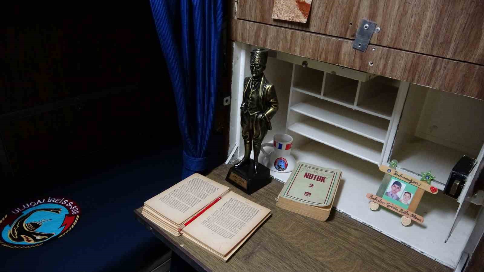 Uluçalireis Denizaltısı Odası olarak düzenlen bir odasında, denizaltıya ait çeşitli objeler, gemi modeli ve isim levhası bulunuyor.