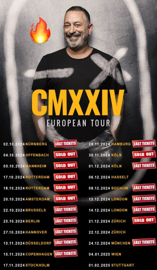 Cem Yılmaz Avrupa’da turneye çıkıyor. 2024 Avrupa turnesi ‘CMXXIV’ adlı ile sevenlerinin karşısına çıkacak. Yılmaz’ın 2024 sonuna kadar 24 gösteriye çıkması bekleniyor.