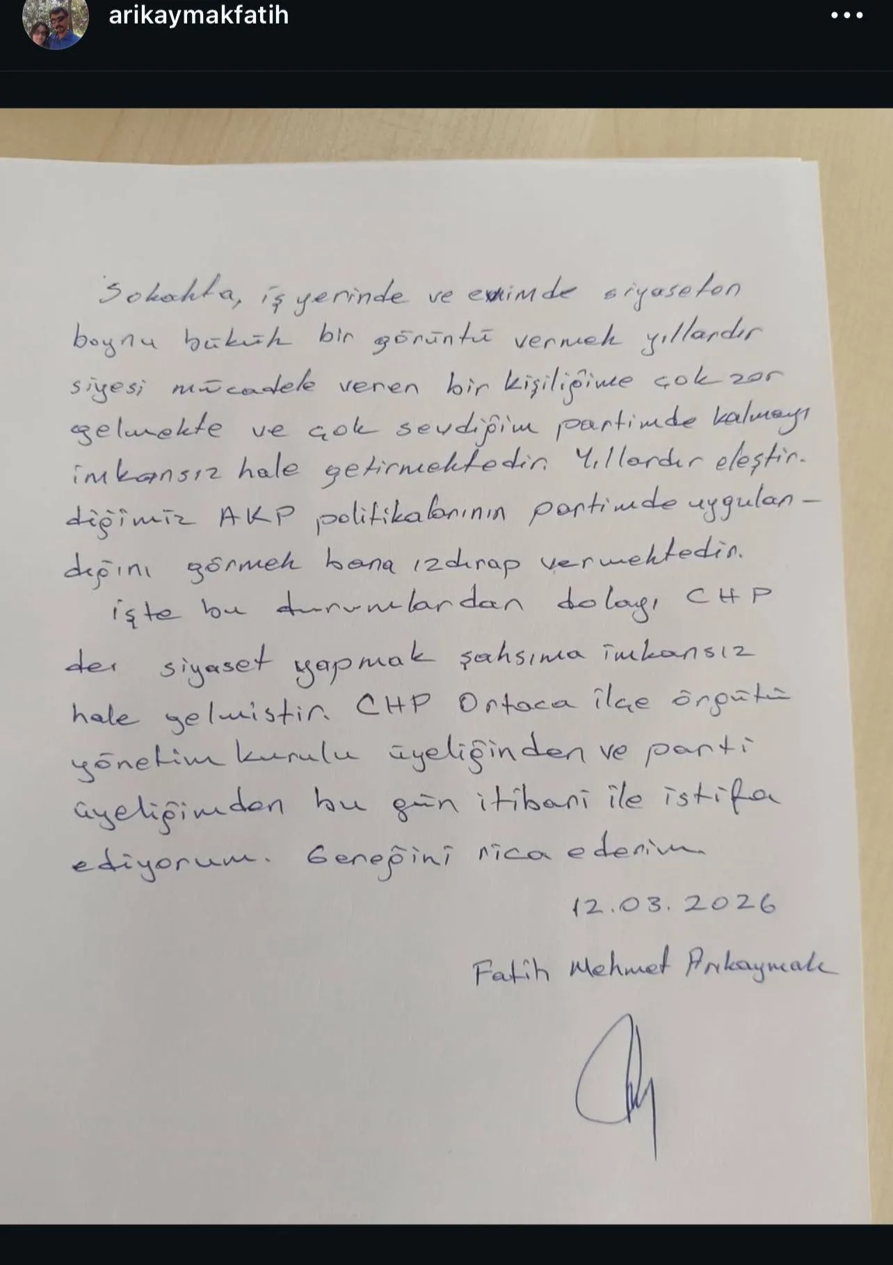 Arıkaymak açıklamasında, CHP Ortaca İlçe Örgütü Yönetim Kurulu üyeliğinden ve parti üyeliğinden bugün itibarıyla istifa ettiğini belirtti.