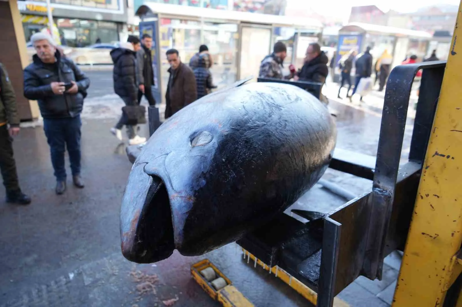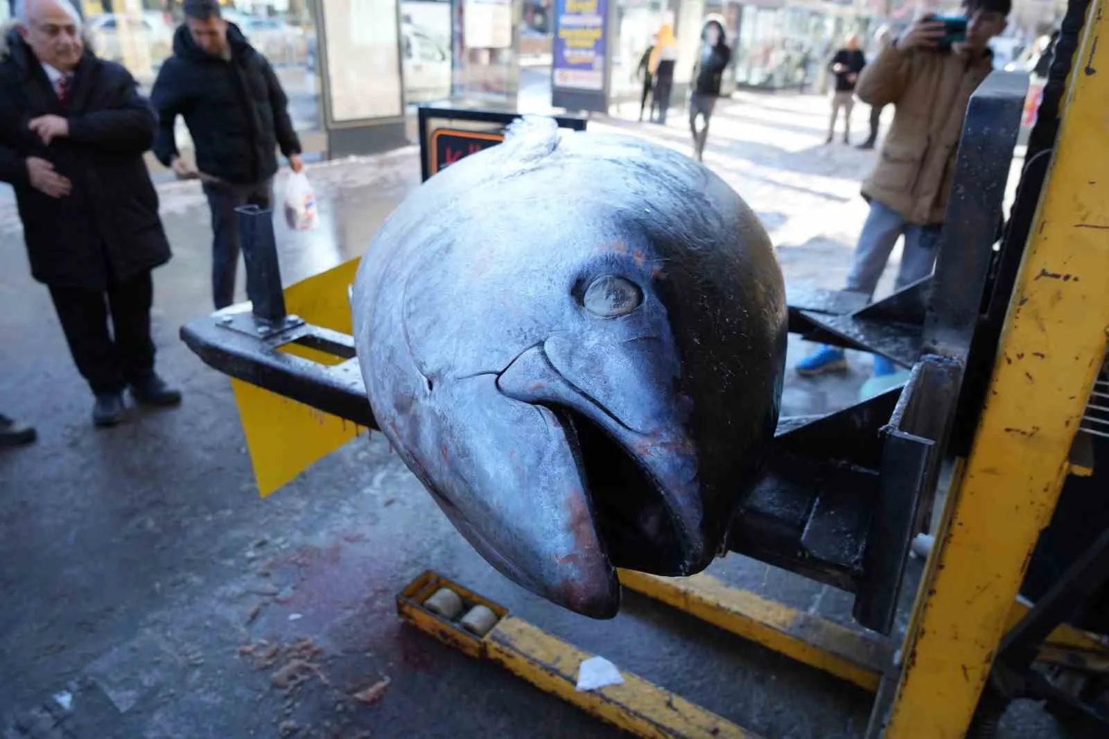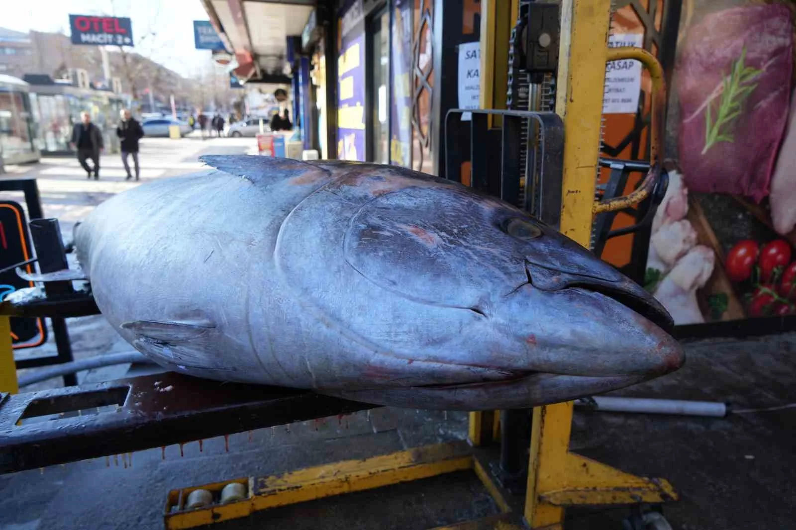 Erzincan’da balık tezgâhlarında ender rastlanan bir görüntü yaşandı. Atlantik Okyanusu’ndan avlanan ve yaklaşık 3 metre uzunluğa, 365 kilogram ağırlığa sahip dev orkinos balığı, kent merkezinde sergilenerek vatandaşların beğenisine sunuldu.