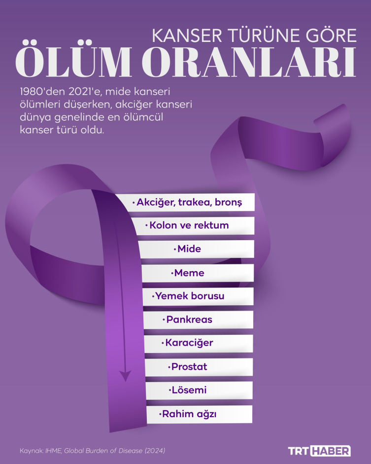 Verilere göre, akciğer kanseri dünya çapında en fazla ölüme neden olan kanser türü. Sigara tüketiminin bu tablo üzerindeki etkisi belirgin. Onu, kolorektal, mide ve meme kanserleri takip ediyor.