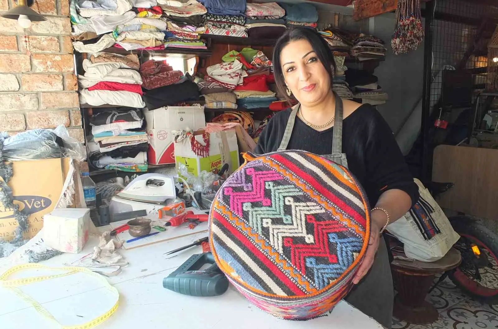 Balıkesir Burhaniye’de oturan 1 çocuk annesi Handan Hasgül, eski halı ve kilimlerin çöpe atılmasına gönlü elvermeyince Kavakdibi Caddesinde kurduğu atölye de üretime başladı. Eski halı ve kilimlerin sağlam olan bölümlerini ayıran Hasgül, bunlardan yastık ve kırlentler yaparken, şimdi de rengarenk puflar üretmeye başladı. İç piyasa da ilgi gören pufları yurt dışına da gönderdiklerini anlatan Handan Hasgül, işini severek yaptığını söyledi.