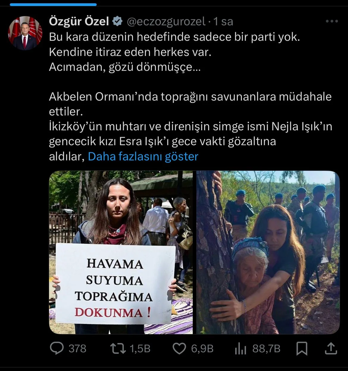 CHP Genel Başkanı Özgür Özel, Muğla’da Akbelen sürecinde tutuklanan Esra Işık’a sosyal medya paylaşımıyla tepki gösterdi.