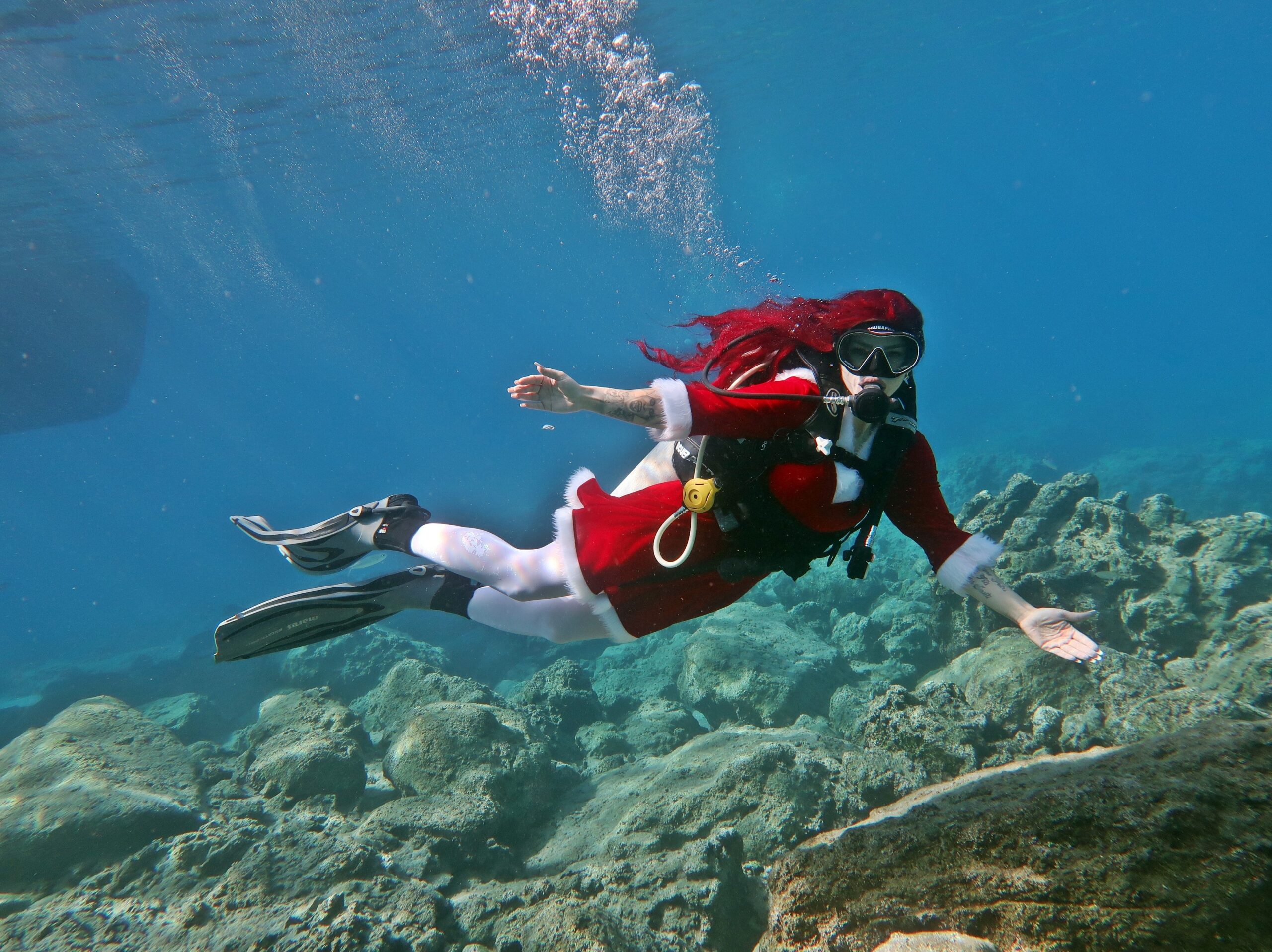 Fethiye’nin gözde dalış noktalarından Dalyan Koyu’nda, ilginç ve renkli bir etkinlik gerçekleştirildi. Dalgıç Niky Grey, yılbaşı kutlamalarına deniz altından farklı bir boyut kazandırarak, “Mutlu Noeller” yazılı pankartla denizin 5 metre altına daldı. Yeni yıl temalı bir kostüm giyen kadın dalgıç, dalışı sırasında rengârenk balıkların eşlik ettiği unutulmaz anlara imza attı.