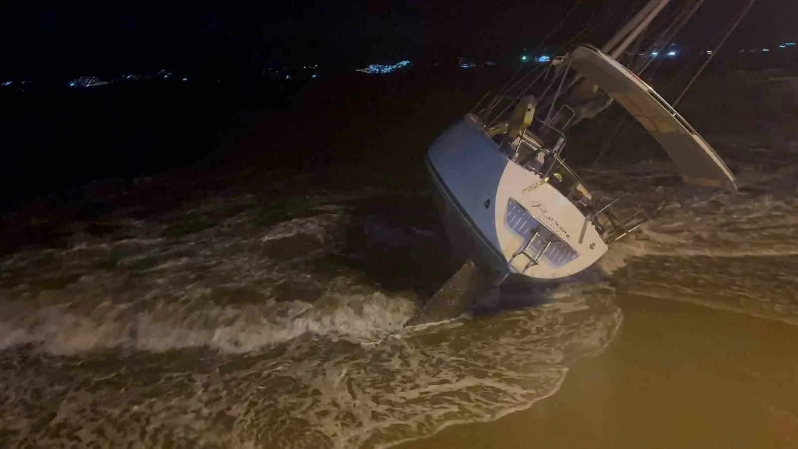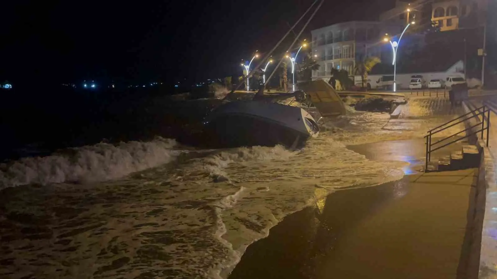 Muğla’nın Milas ilçesinde etkili olan kuvvetli fırtına, kıyıda demirli milyonluk tekneyi karaya sürükledi.