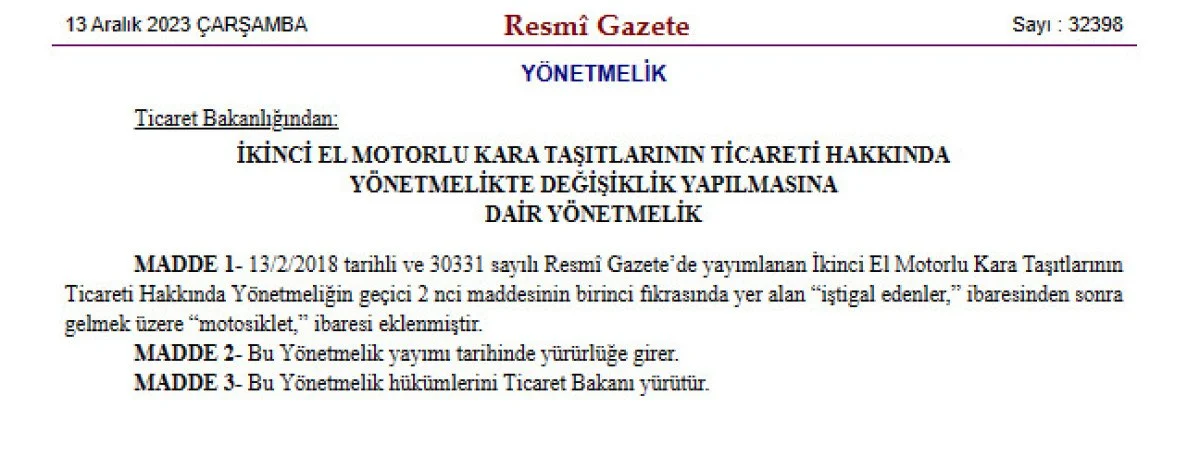 İkinci el araçların, sıfır fiyatlarından yüksek bir fiyatla satışa çıkarılmasının yasaklanmasına ilişkin yönetmeliğe motosikletler de dahil edildi. Karar 1 Temmuz 2024 tarihine kadar geçerli olacak. Ticaret Bakanlığı bu kararı uzatabilecek.