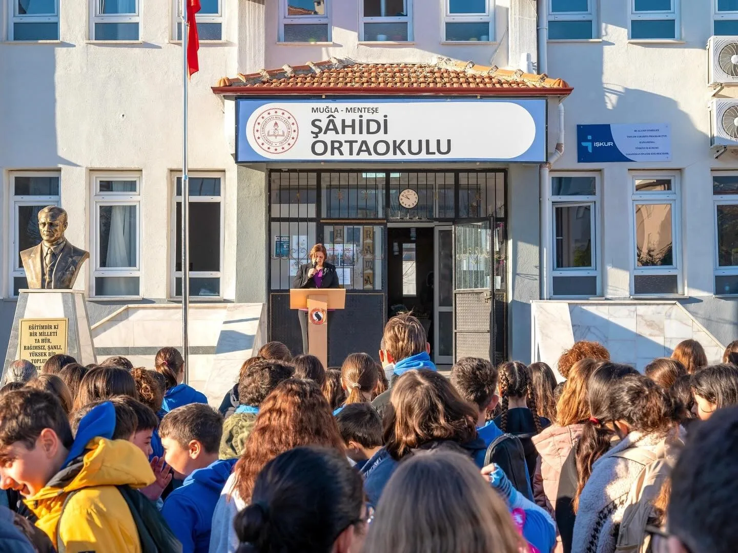 Menteşe İlçe Milli Eğitim Müdürü Mehmet Keleş, Şâhidi Ortaokulu ziyaretinde bayrak törenine katılarak öğrencilerle sınıflarda buluştu ve okul yönetimiyle akademik başarıyı artırmaya yönelik stratejik değerlendirmeler yaptı.