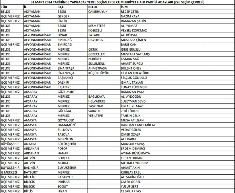 İşte CHP’nin belli olan 227 belediye başkan adayının tam listesi: