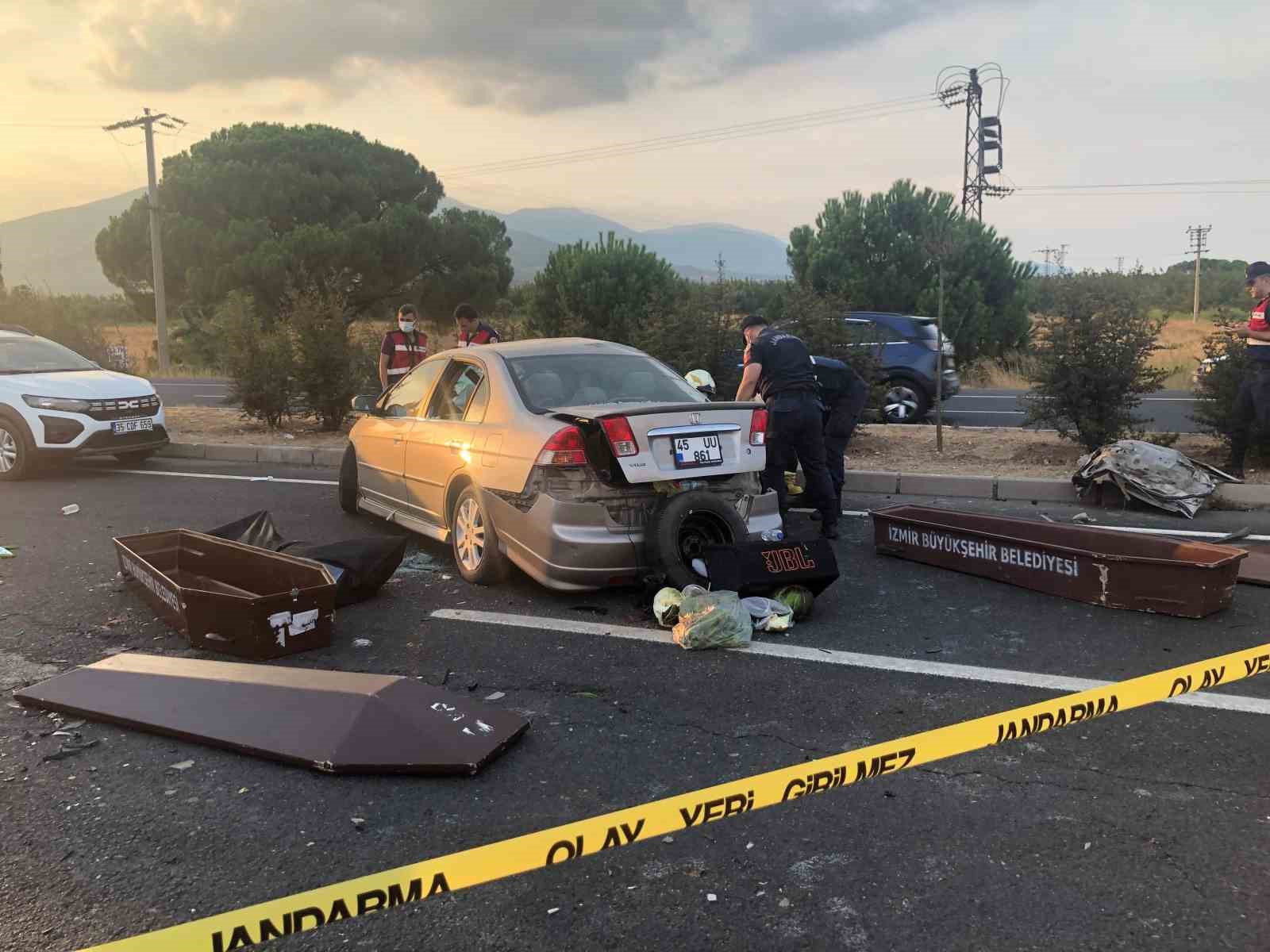 Kaza, saat 18.00 sıralarında İzmir-Ankara Caddesi Armutlu yol ayrımı yakınında meydana geldi. Edinilen bilgiye göre, Turgutlu istikametinden İzmir istikametine seyir halinde olan Hüseyin Ali Ceylan (54) idaresindeki 45 UU 861 plakalı otomobil, sürücüsünün direksiyon hakimiyetini yitirmesi sonucu refüjü aşarak karşı yöne geçti. Araç bu esnada Turgutlu istikametine seyir halinde olan Tuncay Y. (54) idaresindeki 35 BMK 730 plakalı otomobile çarpışırken, meydana gelen kazada yol adeta savaş alanına döndü. Kazanın bildirilmesi üzerine olay yerine jandarma ve sağlık ekipleri sevk edildi. Jandarma tarafından yolda güvenlik önlemleri sağlanırken, meydana gelen kazada 45 UU 861 plakalı otomobil içerisinde bulunan sürücü Hüseyin Ali Ceylan ve Zeliha Ceylan’ın (56) hayatını kaybettikleri belirlendi. Diğer araçta bulunan sürücü Tuncay Y. ile yolcu konumunda bulunan Gülay Y. ve Bekir Y., ağır yaralı olarak Turgutlu Devlet Hastanesine kaldırıldı.