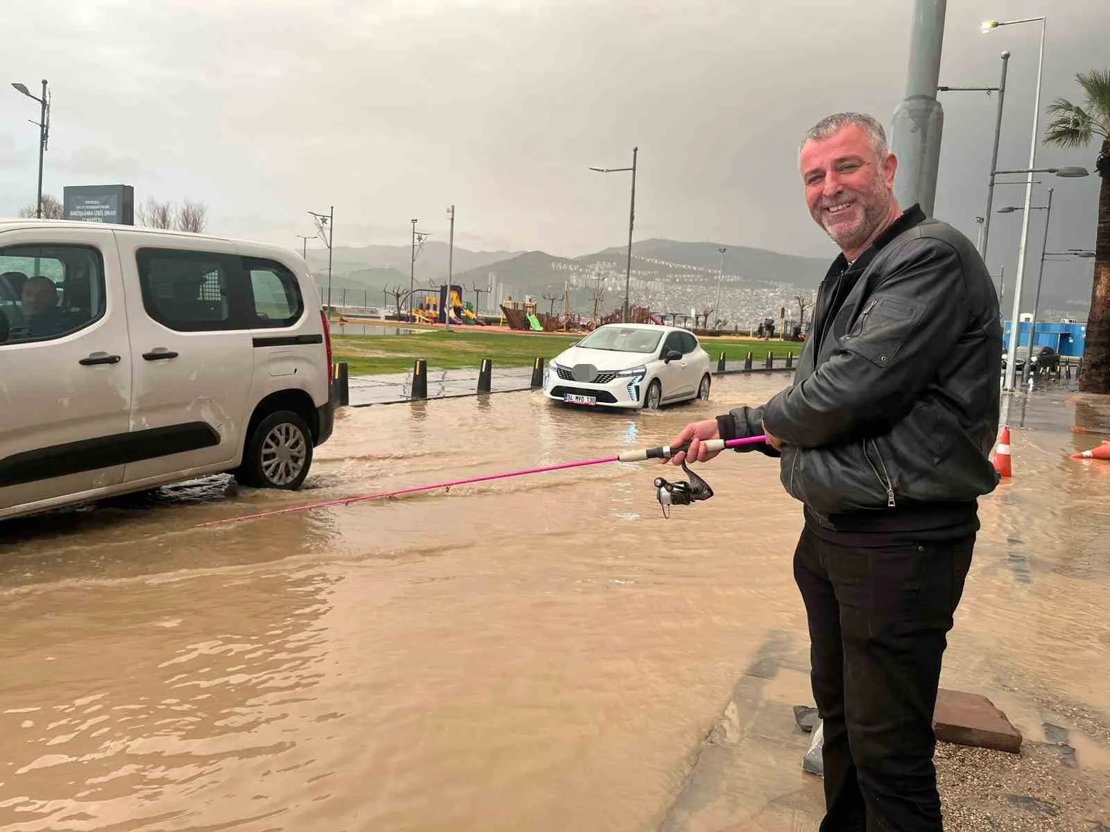 Kent genelinde öğle saatlerinde başlayan şiddetli yağış, özellikle merkez ilçelerde etkisini hissettirdi. Konak ilçesine bağlı Alsancak ve Kordon Boyu mevkilerinde yağışla birlikte altyapıda geri tepmeler meydana geldi. Rögarların taşması sonucu yollar ve sahil şeridindeki yeşil alanlar suya teslim oldu. Yükselen su seviyesi nedeniyle araçlar ilerlemekte güçlük çekerken, bölgedeki vatandaşlar da zor anlar yaşadı. Su baskınının yaşandığı alanda bir vatandaş ise duruma dikkat çekmek için ilginç bir yönteme başvurdu. Göle dönen caddede eline aldığı oltayı su birikintisine atan Hakan Acat, altyapı sorunlarına balık tutmaya çalışarak tepki gösterdi. Acat, bu durumun Kordon’da sürekli yaşandığını dile getirdi.