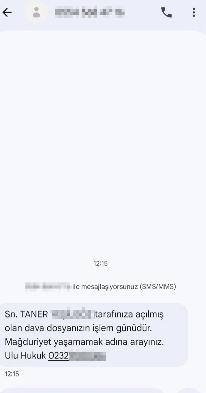İzmir’de bulunan bir hukuk bürosunun adını kullanarak vatandaşlara “Tarafınıza açılmış dava dosyanızın işlem günüdür” şeklinde mesajlar gönderen dolandırıcılık şebekesi, kurdukları sahte e-Devlet sitesi üzerinden çok sayıda kişiyi tuzağa düşürdü. Hukuk bürosunun sahibi Avukat Yasin Ulu, telefonuna gelen yüzlerce çağrı üzerine dolandırıcılığı fark ederek, adını ve bürosunu kullanan şebeke hakkında suç duyurusunda bulundu.
