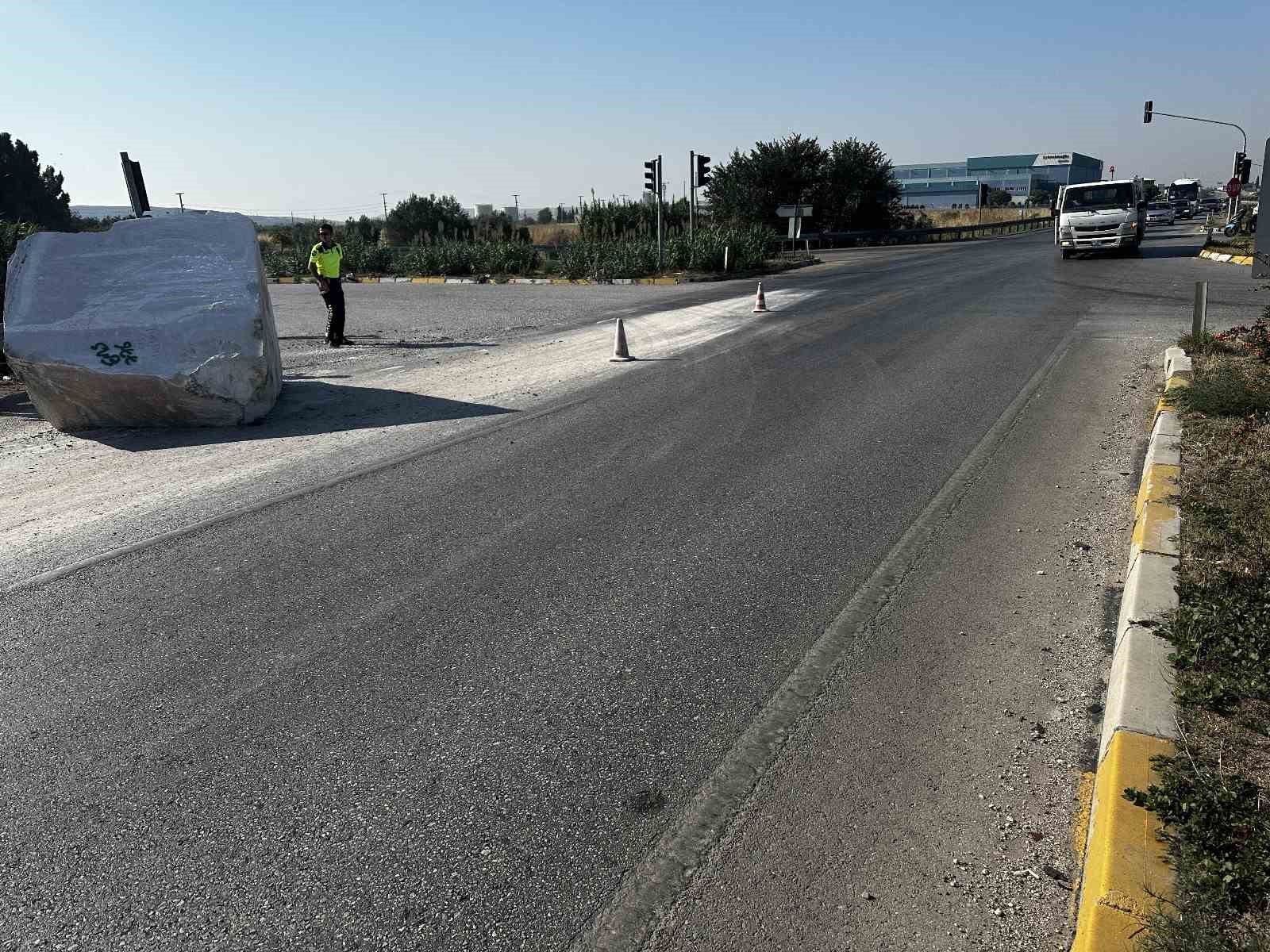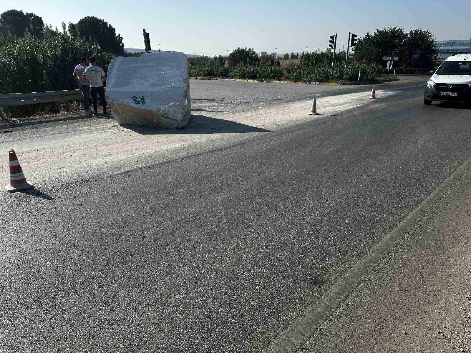 Akhisar’ın Kayalıoğlu Mahallesi girişinde, İzmir’den Balıkesir yönüne ilerleyen mermer yüklü bir tır, Organize Sanayi Bölgesi (OSB) kavşağında kontrolden çıktı ve tonlarca mermer blok halinde yola savruldu. Tonlarca ağırlıktaki mermer bloğunun aniden yola düşmesi, büyük bir tehlikeye neden olurken, şans eseri o esnada yol üzerinde başka bir aracın bulunmaması olabilecek bir faciayı önledi.