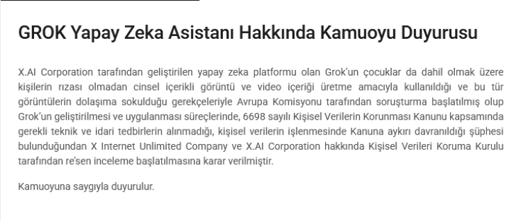 Kuruldan yapılan açıklamada, Grok’un çocuklar da dâhil olmak üzere kişilerin rızası olmadan cinsel içerikli görüntü ve video üretiminde kullanıldığı ve bu içeriklerin dolaşıma sokulduğu iddiaları üzerine Avrupa Komisyonu tarafından soruşturma başlatıldığı hatırlatıldı. Açıklamada, Grok’un geliştirilmesi ve uygulanması süreçlerinde 6698 sayılı Kişisel Verilerin Korunması Kanunu kapsamında gerekli teknik ve idari tedbirlerin alınmadığı ve kişisel verilerin işlenmesinde Kanun’a aykırı davranılmış olabileceği şüphesinin bulunduğu belirtildi.