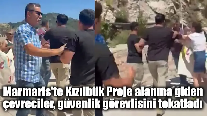 Muğla’nın Marmaris ilçesinde yer alan Kızılbük Termal Proje Sahası’na gelen bir grup, proje alanına zorla girmeye çalıştı. Alanda görevli özel güvenliklerle tartışan gruptaki bazı kişilerin güvenlik görevlisini itekleyerek tokat attığı belirtildi. Cep telefonu kamaerasına yansıyan görüntüler de izleyenleri şaşırttı.