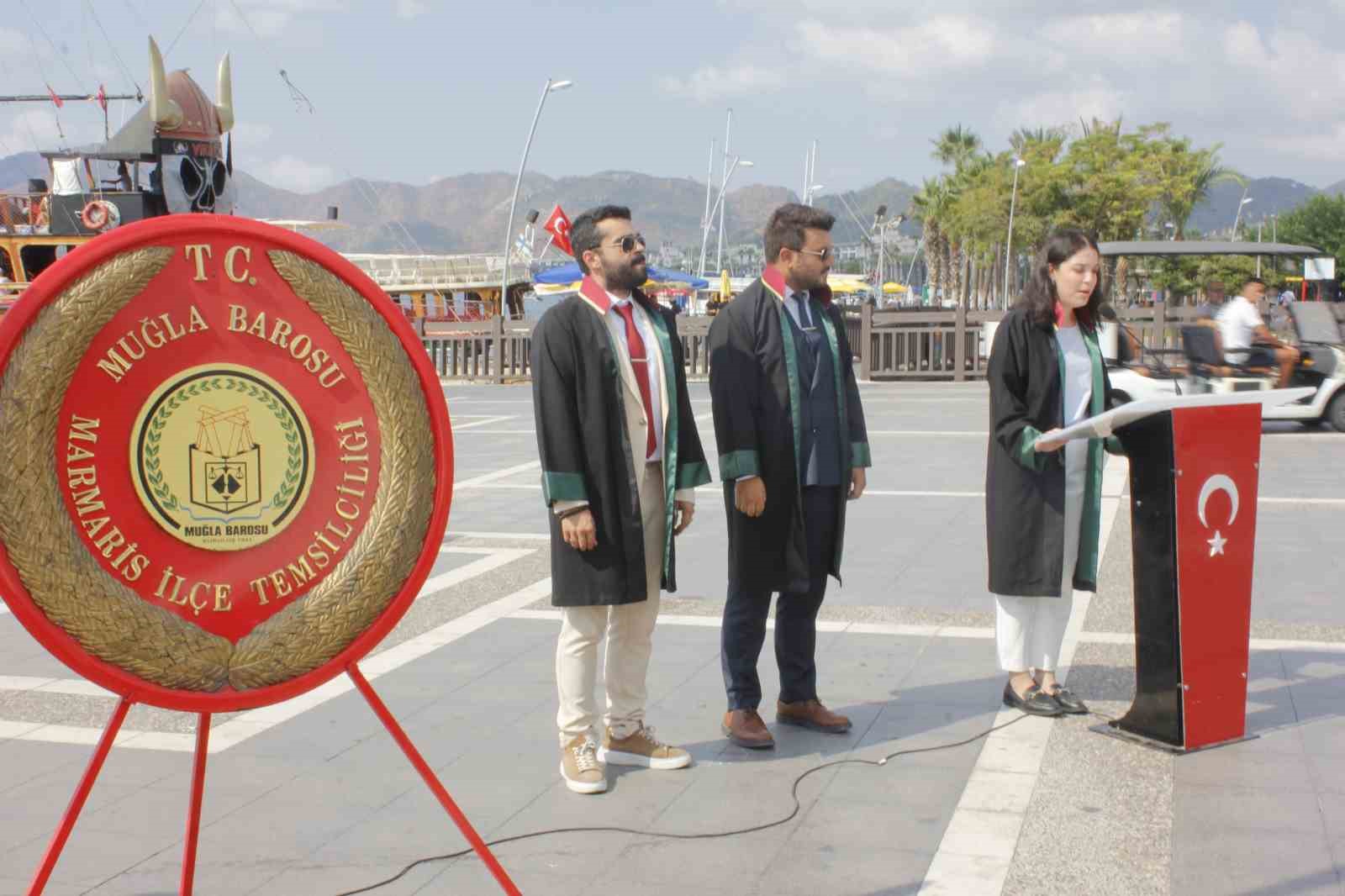 2024-2025 Adli Yıl Açılış Programı, 1 Eylül itibariyle sona eren adli tatilin ardından Marmaris’te düzenlenen törenle kutlandı. Tören, Muğla Barosu Marmaris İlçe Temsilciliği’ne bağlı avukatların Atatürk Meydanı’nda gerçekleştirdiği etkinliklerle başladı. Program kapsamında, tüm şehitler ve kaybettiğimiz gaziler anısına bir dakikalık saygı duruşu gerçekleştirildi, ardından İstiklal Marşı okundu. Muğla Barosu Marmaris İlçe Temsilcisi Avukat Buğra Yavuz ve temsilci yardımcısı Avukat Cemal Akdoğan’ın Atatürk anıtına çelenk sunumu ile devam eden programda Avukat Buğra Yavuz günün anlam ve önemine binaen konuşma yaptı.