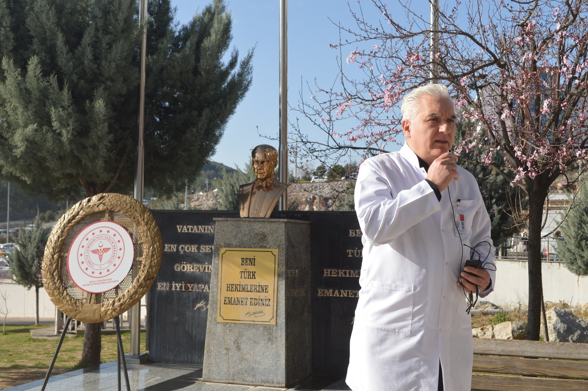 Tören, saygı duruşu ve İstiklal Marşı’nın okunmasıyla başladı. Ardından Başhekim Prof. Dr. Turhan Togan ve Anesteziyoloji ve Reanimasyon Anabilim Dalı Başkanı Prof. Dr. Bakiye Uğur, Atatürk Anıtı’na çelenk sundu.