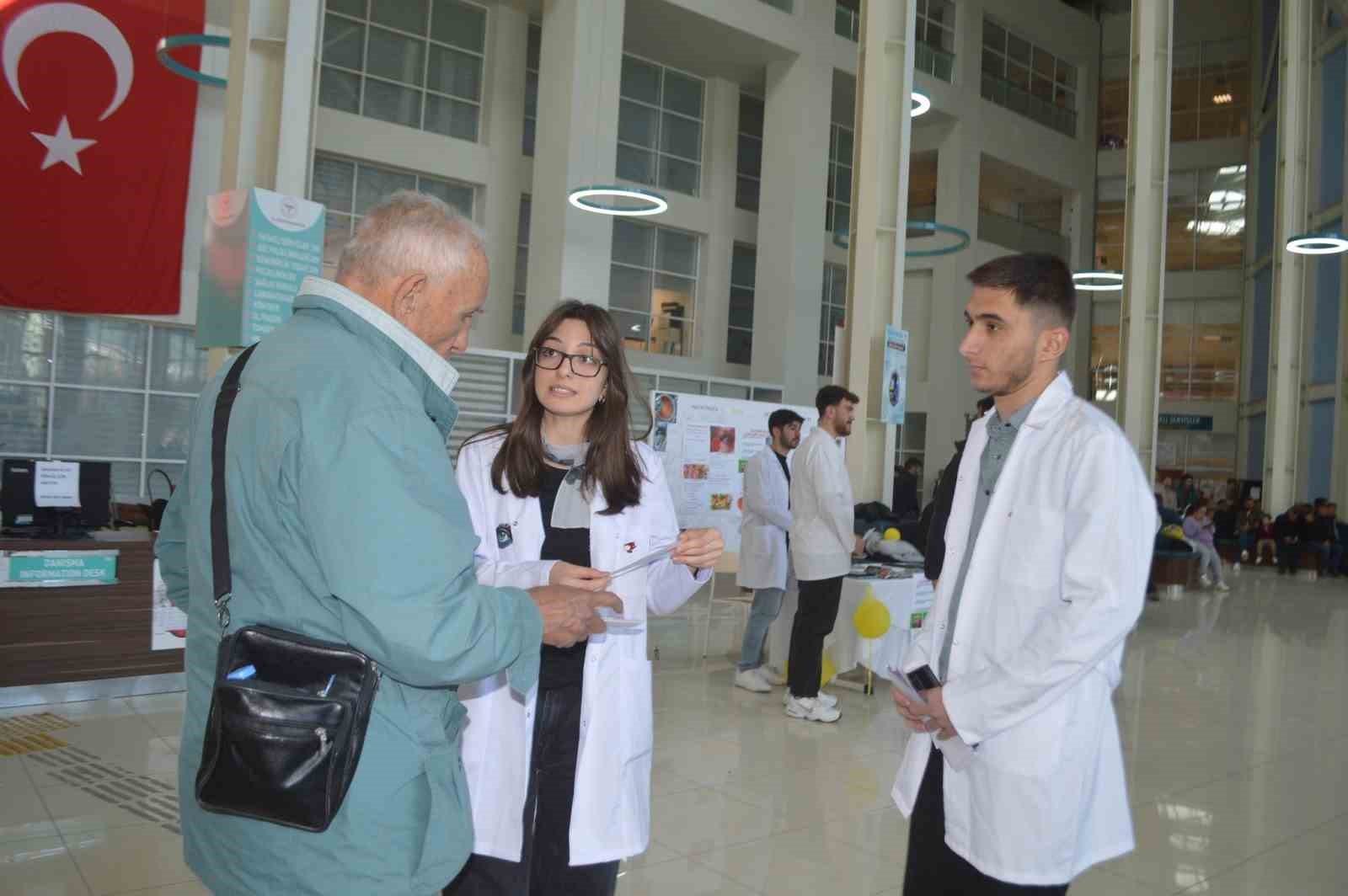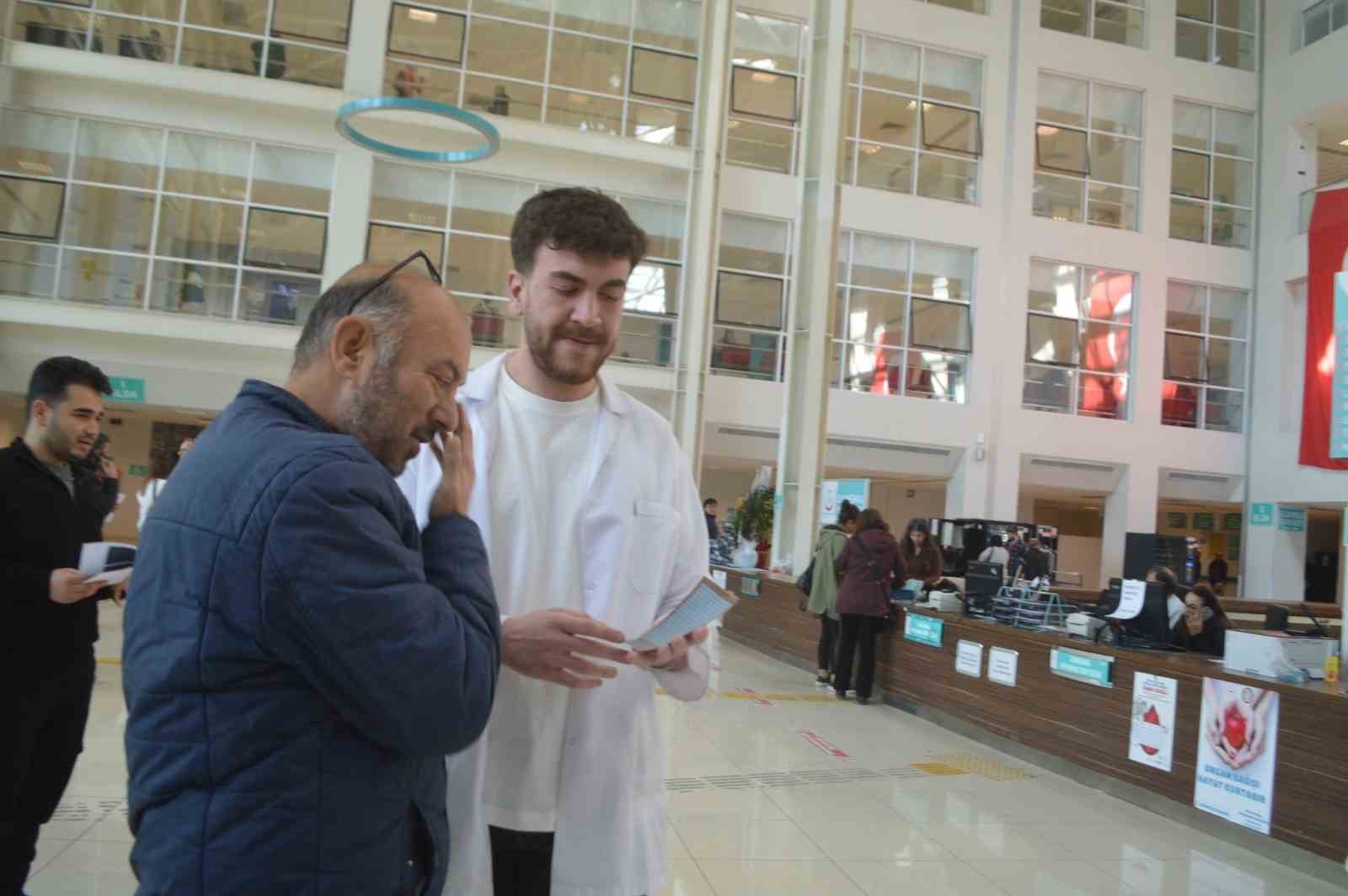 “Görmenize Sarı Nokta Koymayın” sloganıyla gerçekleştirilen etkinlikte, hastane giriş arenasında katılımcılara Amsler Grid (kareli kağıt) testi uygulandı.