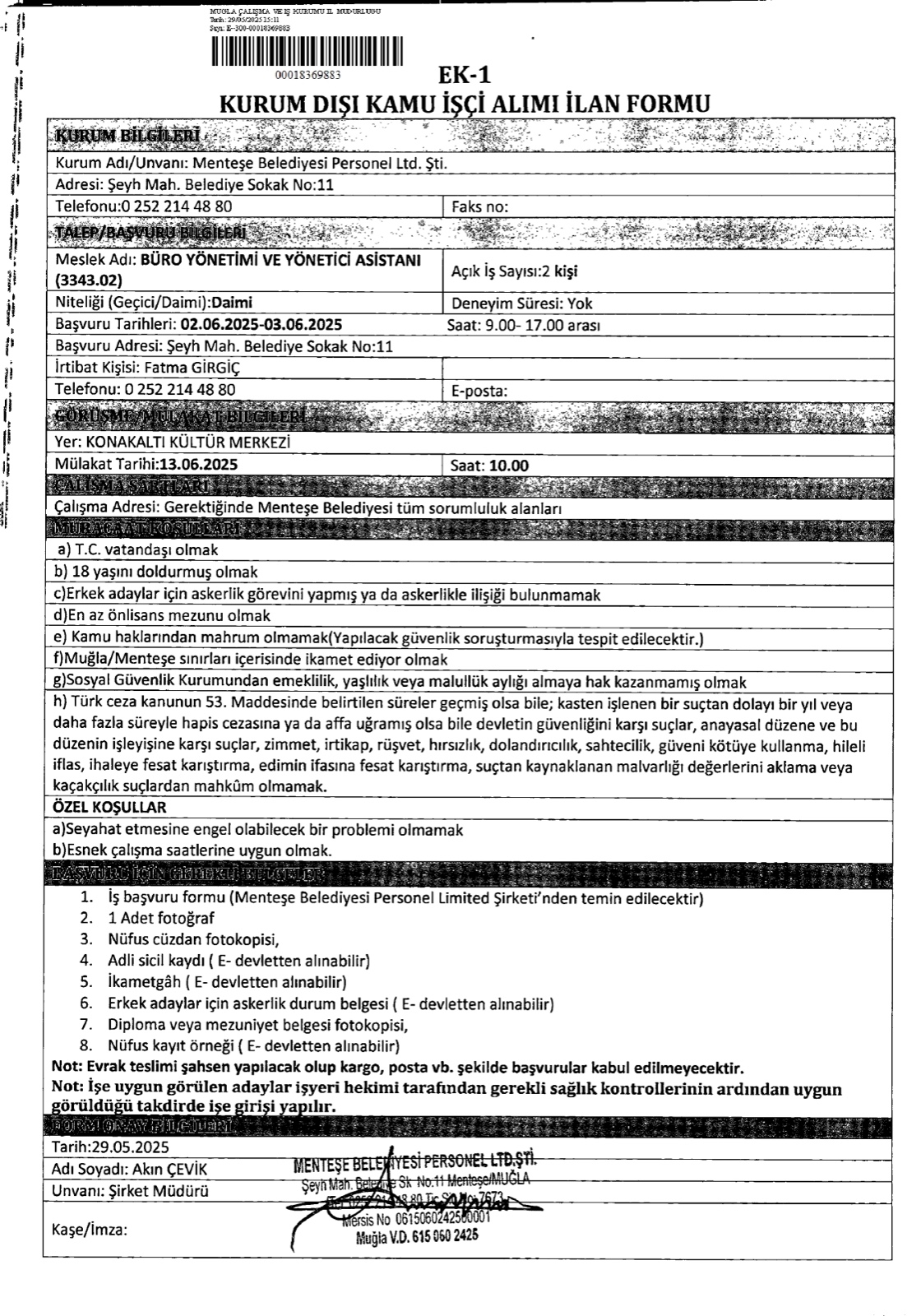 Muğla Menteşe Belediyesi, Büro Yönetimi ve Yönetici Asistanı pozisyonları için 2 personel alımı yapacak. Başvurular 3 Haziran’a kadar şahsen kabul edilecek olup, adayların lise mezunu ve 18 yaşını doldurmuş olması gibi genel şartları taşımaları gerekmektedir.