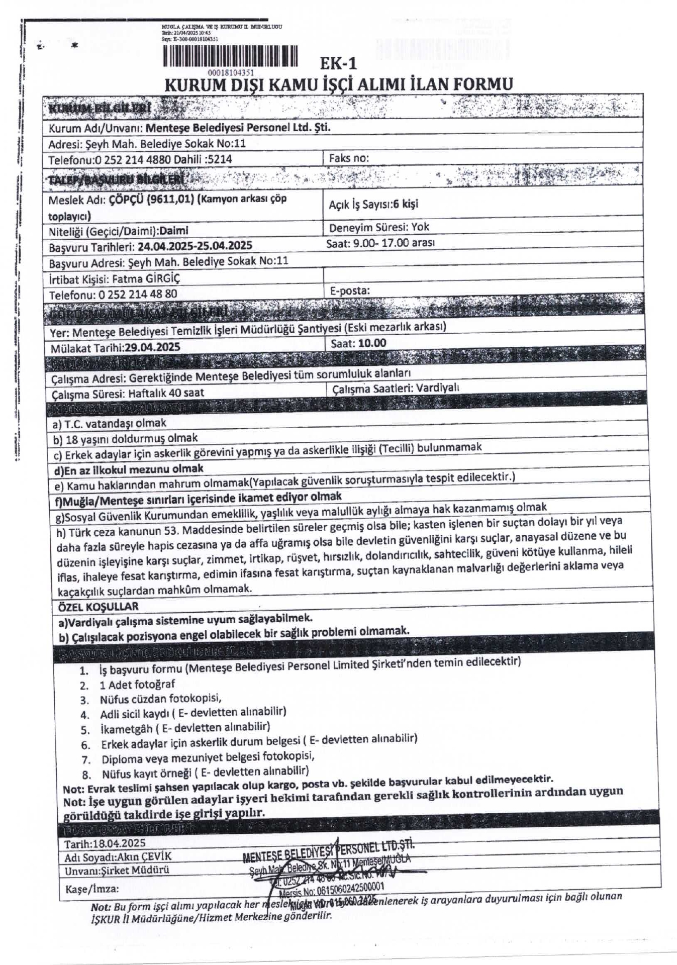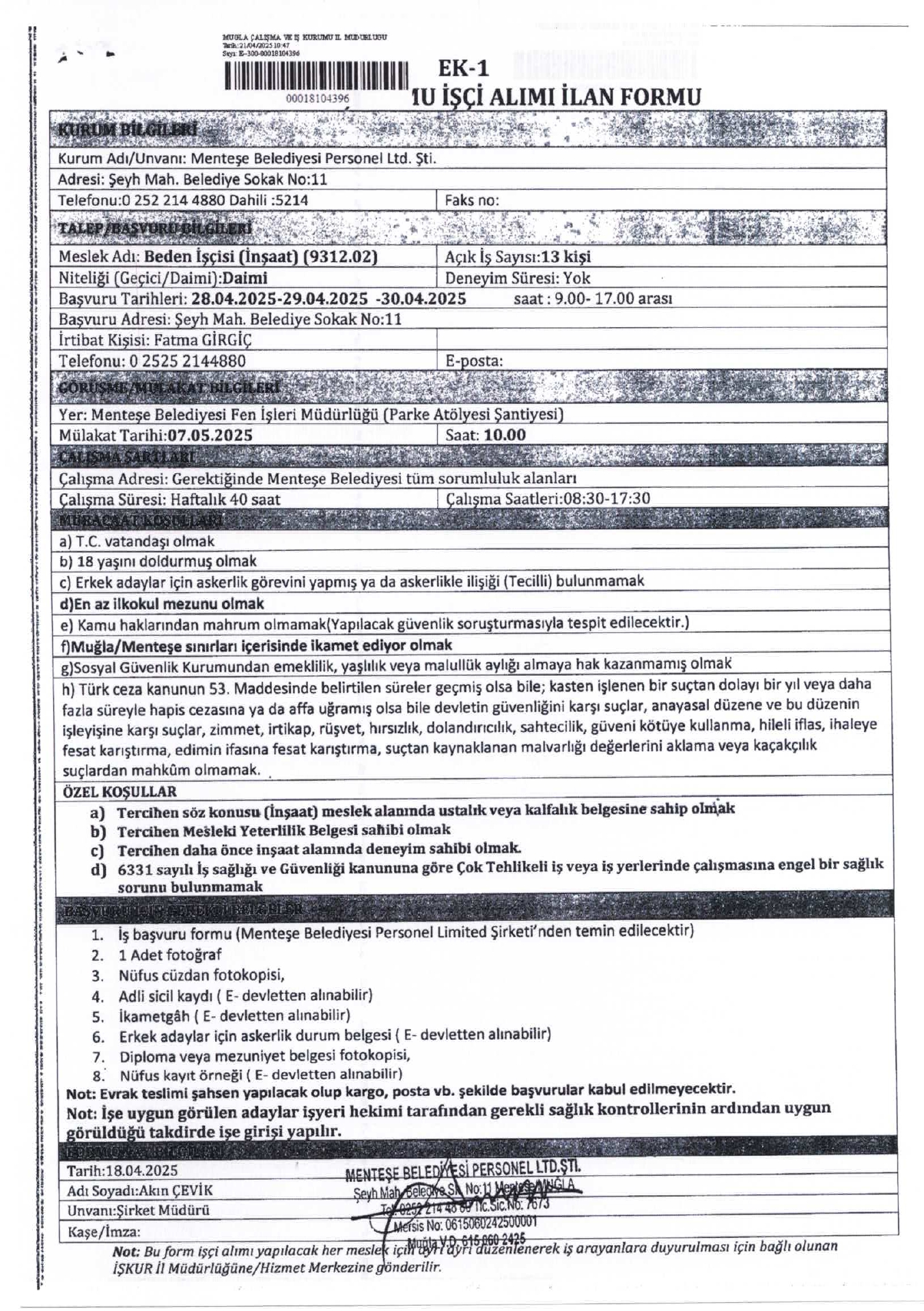 Ana Sayfa › Gündem › Menteşe Belediyesi Personel Alımı YapacakMenteşe Belediyesi Personel Alımı Yapacak Muğla Menteşe Belediyesi, 29 Nisan 2025 son başvuru tarihiyle 19 işçi alımı yapacak. Yenigün Gazetesi TÜM YAZILARI Giriş: 22-04-2025 10:37Güncelleme: 22-04-2025 10:37 Kaynak: HABER MERKEZI Gündem ABONE OL Muğla Menteşe Belediyesi 19 İşçi Alacak. Son başvuru tarihi 29 nisan 2025 olarak açıklandı. Bu haber 243 kez okundu.