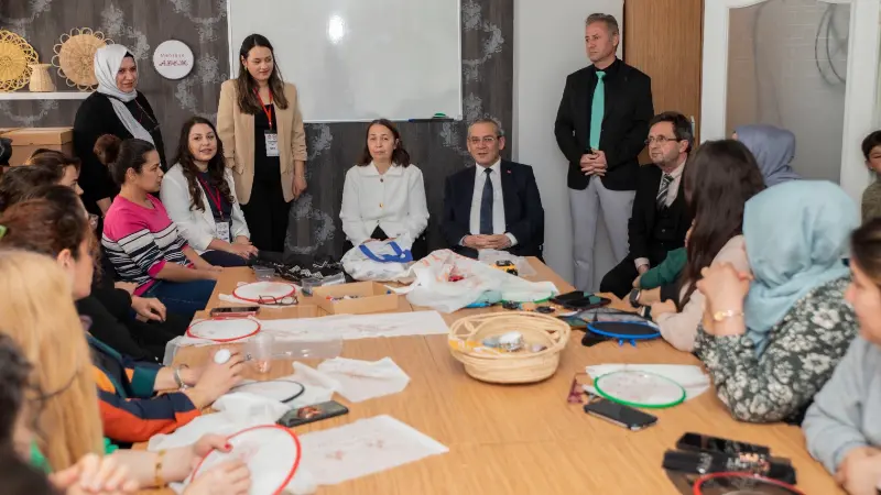 ADEM’de düzenlenen el işi kurslarına katılan kadınların hazırladığı eserleri inceleyen Kaymakam Eriş ve eşi, merkezin koordinatörü Neşe Akmeşe, eğitici Emine İnce Koçar, Halk Eğitim Müdürlüğü’nden görevlendirilen usta öğretici Başak Karanfil ve çocuk öğretmeni Cansu Alan’dan merkezdeki eğitimler ve etkinlikler hakkında bilgi aldı.