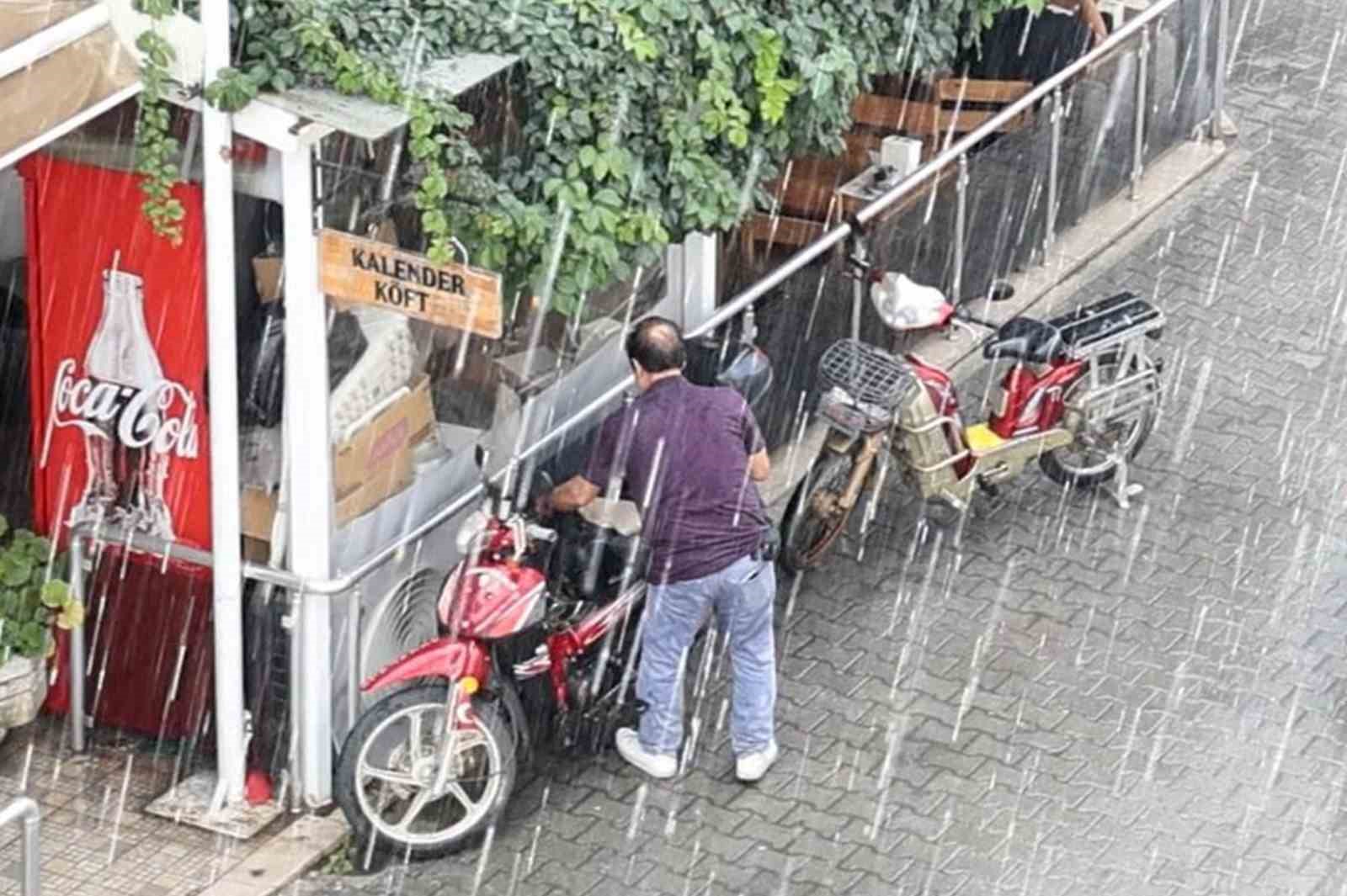 Menteşe ilçesinde güneşli ve yaklaşık 34 derece dolayında seyreden hava sıcaklığında aniden yağmur yağışı başladı. Güneşli havada başlayan yağmur ile sokaktaki vatandaşlar yağmura hazırlıksız yakalandı.