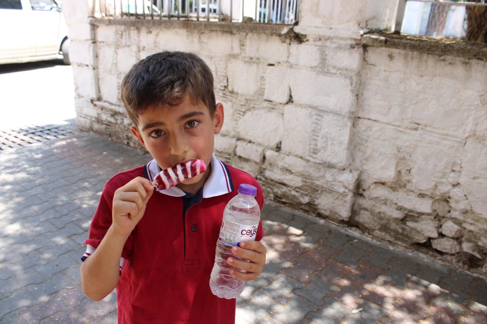 Meteoroloji verilerine göre hava sıcaklığı 33 dereceye kadar yükseldi. Güneşin kendini iyice hissettirdiği ilçede vatandaşlar gölgelik alanlara sığınırken, çocuklar ise serinlemenin en tatlı yolunu seçti.