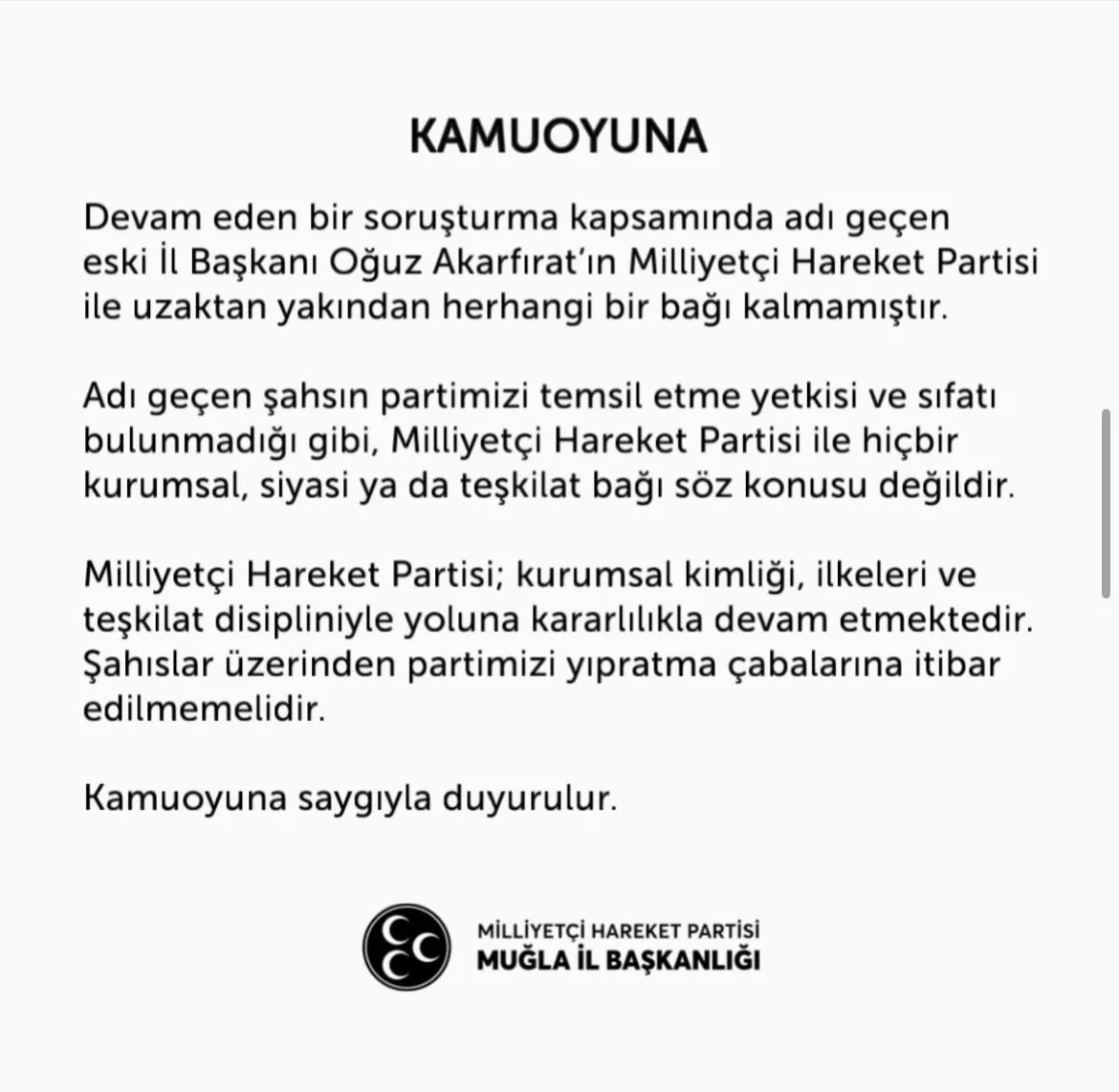 “Devam eden bir soruşturma kapsamında adı geçen eski il başkanımız Oğuz Akarfırat’ın Milliyetçi Hareket Partisi ile uzaktan yakından herhangi bir bağı kalmamıştır. Adı geçen şahsın partimizi temsil etme yetkisi ve sıfatı bulunmadığı gibi, Milliyetçi Hareket Partisi ile hiçbir kurumsal, siyasi ya da teşkilat bağı söz konusu değildir. Milliyetçi Hareket Partisi, kurumsal kimliği, ilkeleri ve teşkilat disipliniyle yoluna kararlılıkla devam etmektedir. Şahıslar üzerinden partimizi yıpratma çabalarına itibar edilmemelidir.”