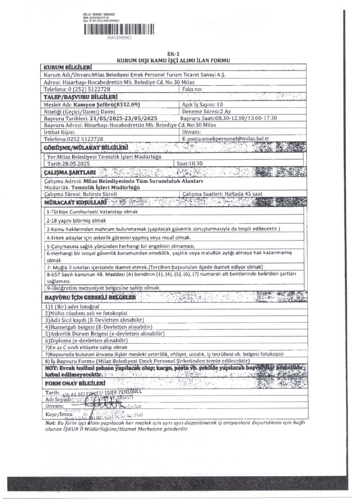 Başvurular, Hısarbaşı-Hocabedrettin Mh. Belediye Cd. No:30 Milas adresindeki Milas Belediyesi Emek Personel Turizm Ticaret Sanayi A.Ş.’ye şahsen yapılacak. 21 Mayıs 2025 tarihinde başlayıp, 23 Mayıs 2025 tarihinde sona erecek olup, 08.30-12.00/13.00-17.30 arasında evraklar kabul edilecek.