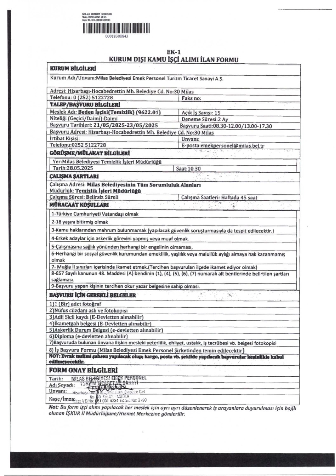 Detaylı bilgi için Milas Belediyesi Emek Personel Turizm Ticaret Sanayi A.Ş. ile iletişime geçilebilir.