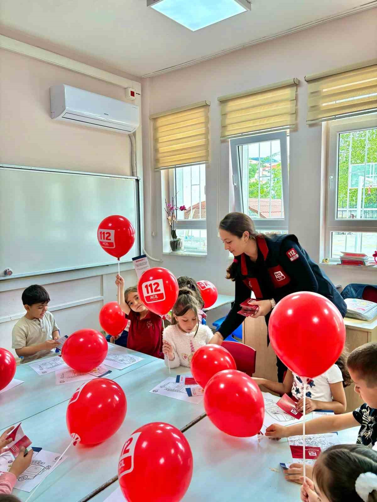 Çocukların yoğun ilgi gösterdiği etkinlikte, 112 Acil Çağrı Merkezi’nin sadece ambulans değil; polis, jandarma, itfaiye ve AFAD gibi birçok acil hizmete tek numarayla ulaşılmasını sağladığı anlatıldı.