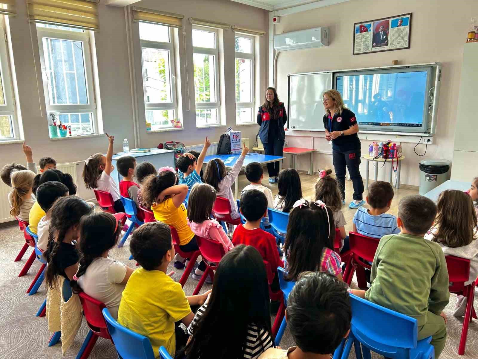 Çocukların yoğun ilgi gösterdiği etkinlikte, 112 Acil Çağrı Merkezi’nin sadece ambulans değil; polis, jandarma, itfaiye ve AFAD gibi birçok acil hizmete tek numarayla ulaşılmasını sağladığı anlatıldı.